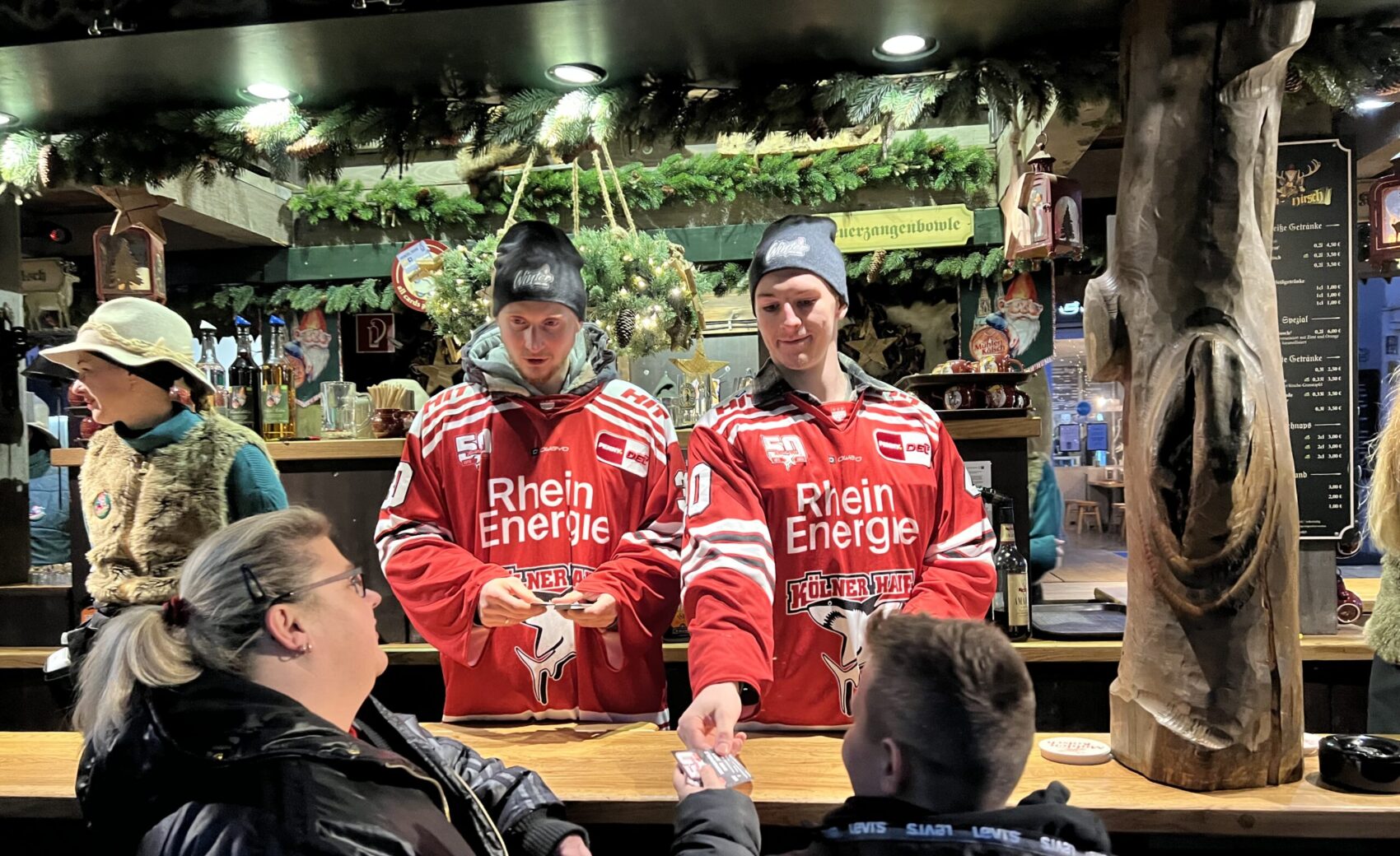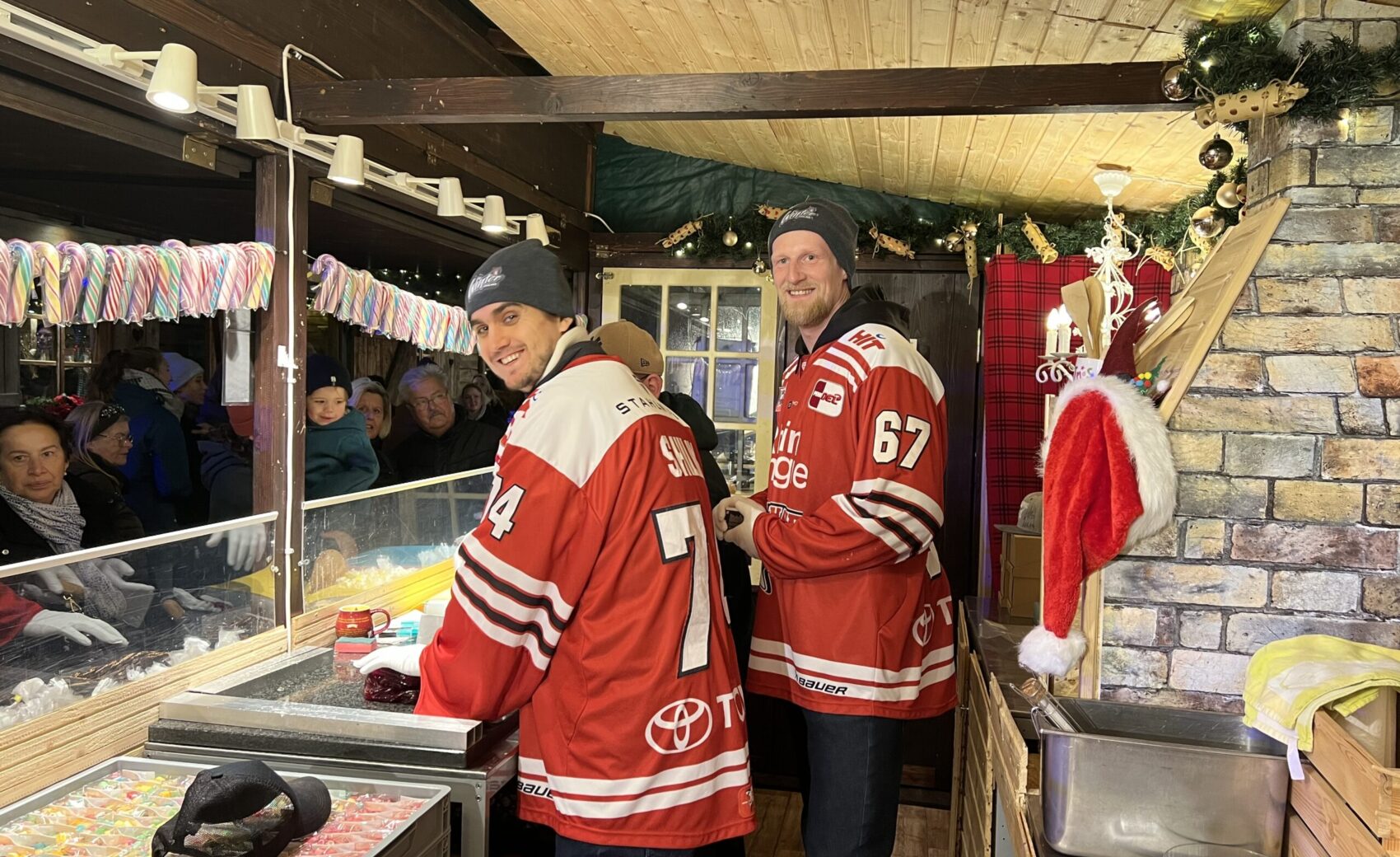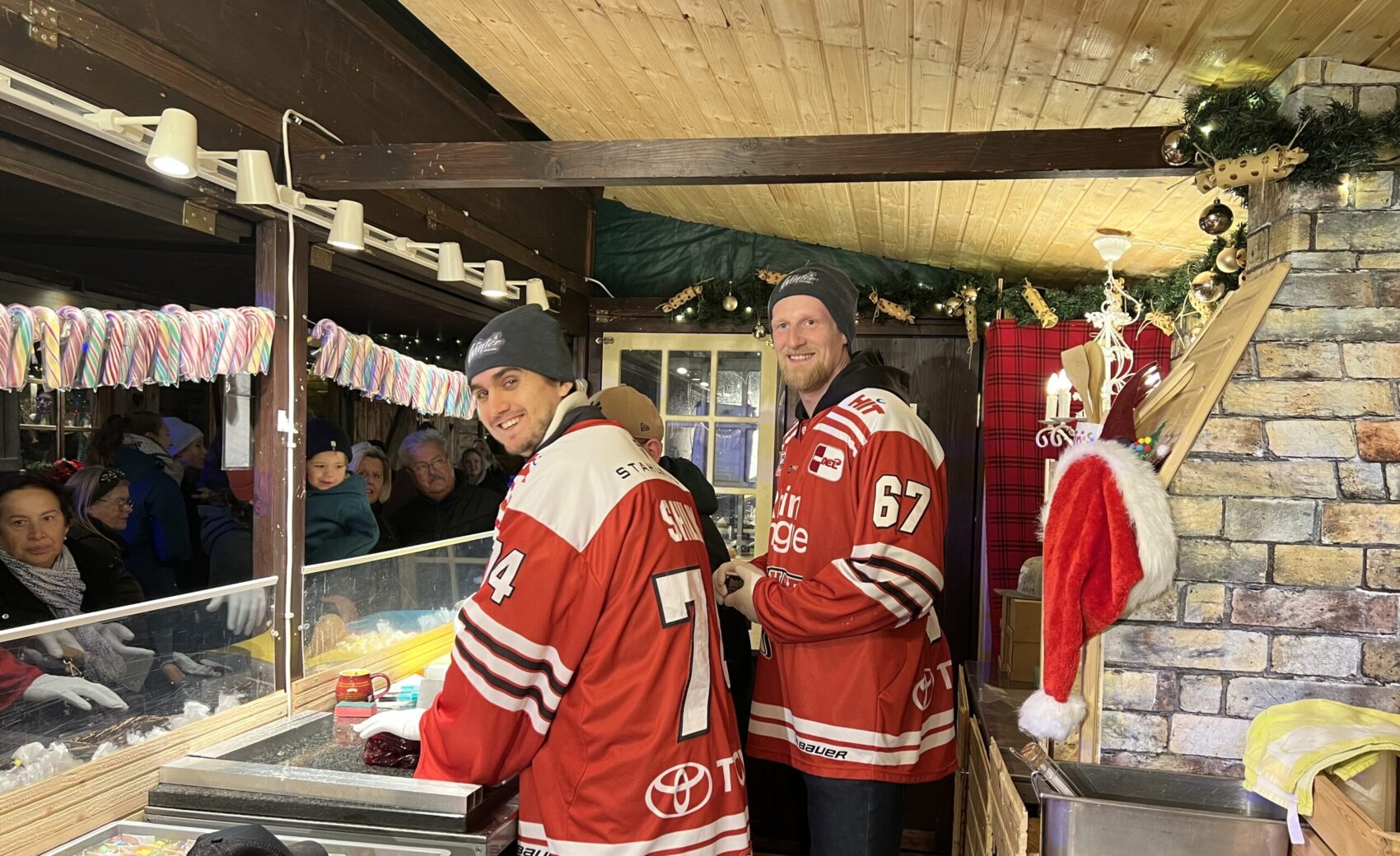 Mit den roten Heim-Trikots und einer DEL WINTER GAME Mütze ausgestattet, standen unsere Jungs in den vielen Buden auf dem Weihnachtsmarkt und packten fleißig mit an. Die Mannschaft war dabei, immer in Zweier-Teams, unter anderem als Schankhilfe in den Glühwein-Buden, als Trainer auf der Eisbahn, als Kassierer am Riesenrad oder als Verkäufer in der Bäckerei im Einsatz.