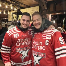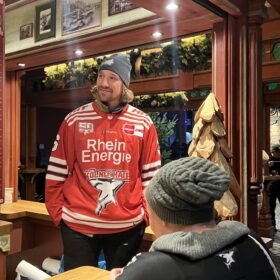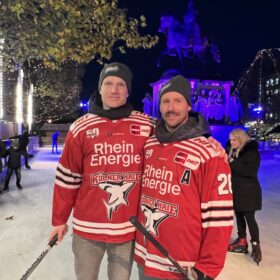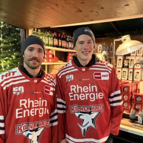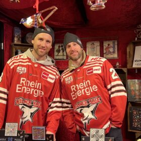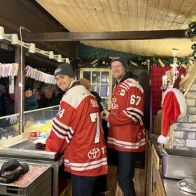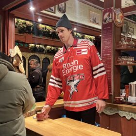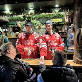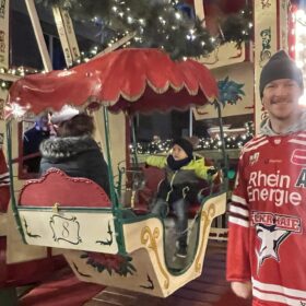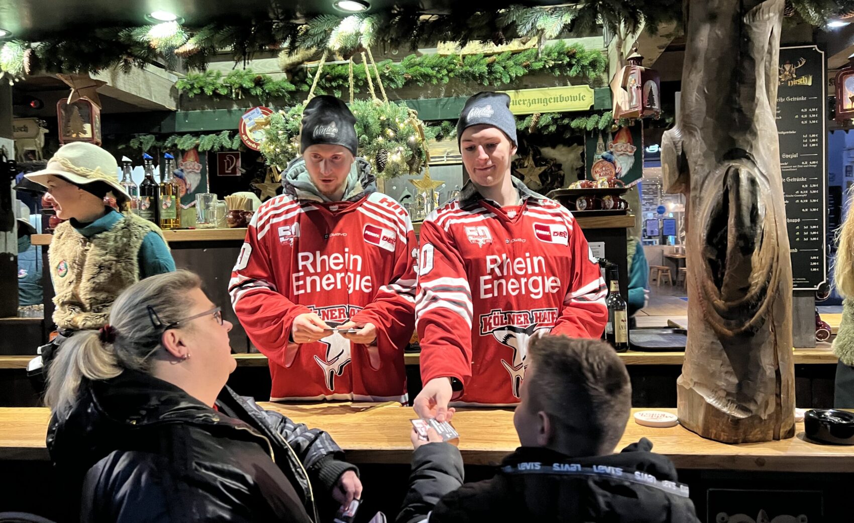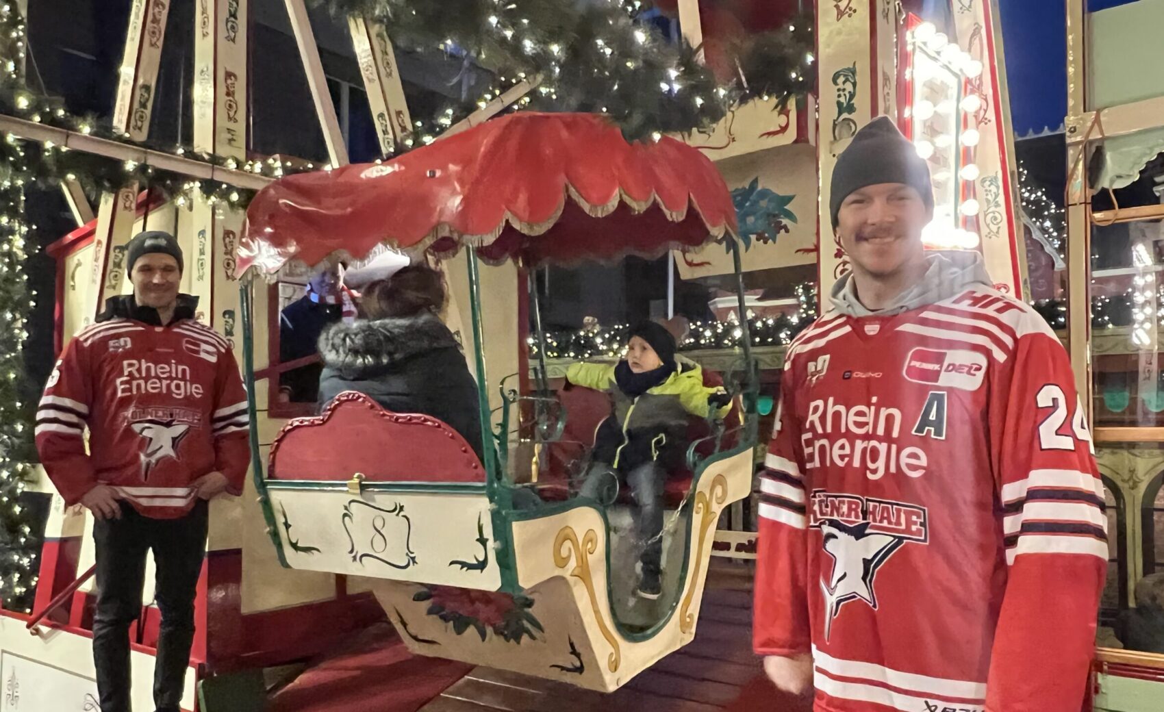 Mit den roten Heim-Trikots und einer DEL WINTER GAME Mütze ausgestattet, standen unsere Jungs in den vielen Buden auf dem Weihnachtsmarkt und packten fleißig mit an. Die Mannschaft war dabei, immer in Zweier-Teams, unter anderem als Schankhilfe in den Glühwein-Buden, als Trainer auf der Eisbahn, als Kassierer am Riesenrad oder als Verkäufer in der Bäckerei im Einsatz.