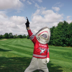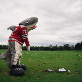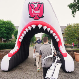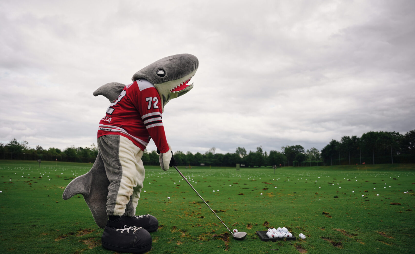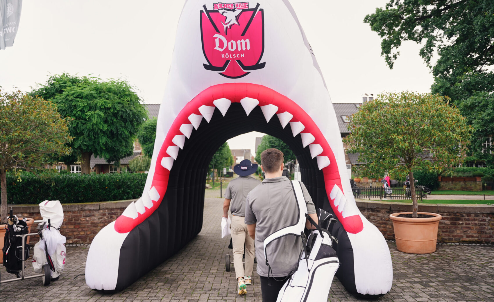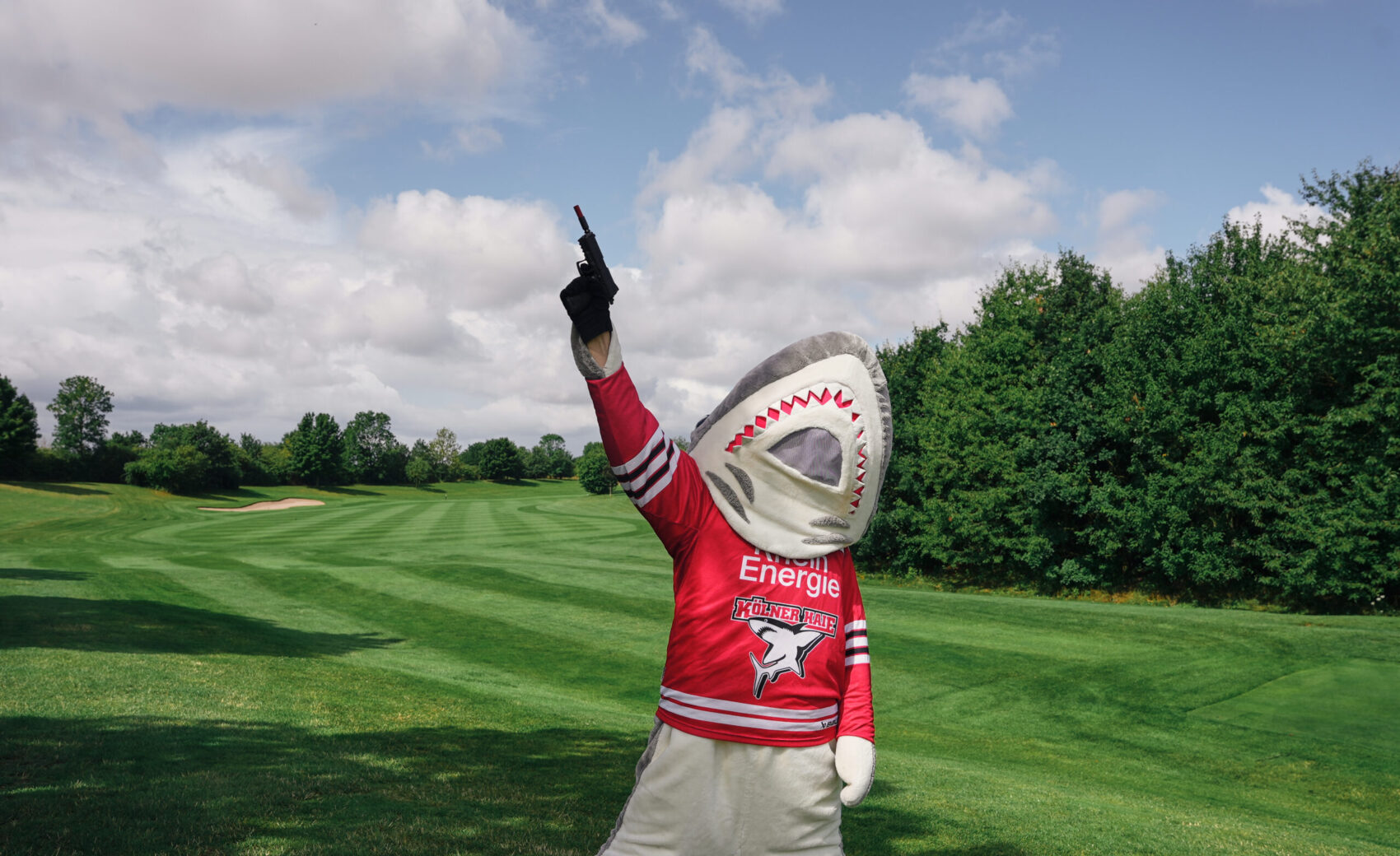 Um 11:30 Uhr eröffnete Sharky mit dem traditionellen „Kanonenschuss“ den diesjährigen Haie Golf Cup. Anschließend begaben sich die 95 Teilnehmer, darunter 19 Haie-Profis – aufgeteilt auf 24 Flights (Gruppen) über das wunderschön angelegte Gelände des Golf-Club Schloss Miel im westlich von Bonn gelegenen Swisttal.