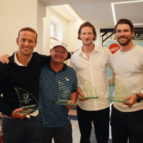 Den Tagessieg beim diesjährigen Haie Golf Cup sicherte sich der Flight mit unseren Neuzugängen Andrej Šustr und Alexandre Grenier sowie Mannschaftszahnarzt Dr. Alexander Langenbach und Haie-Partner Sebastian Jonas. Mit acht Schlägen unter Par spielte das Quartett eine blitzsaubere Runde. Ganz überraschend kam der Sieg im Nachhinein nicht, denn mit einem Handicap von -8 ist der Neuzugang aus Kanada, Alexandre Grenier, aktuell der Haie-Spieler mit dem niedrigsten Handicap.