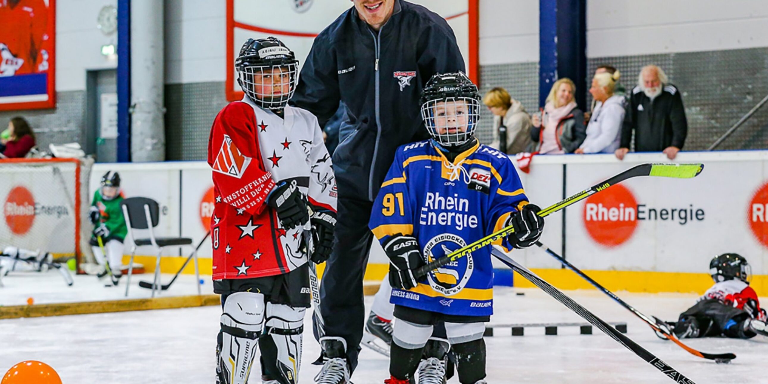 Dort warteten neben Haie-Maskottchen Sharky schon Jugendtrainer sowie einige Haie-Profis, um den Kids mit verschiedenen Übungen ihre ersten Schritte auf dem Eis zu ermöglichen. Und die waren sofort mit Eifer dabei. Es wurde gerutscht und gelacht, aber auch schon geskatet und das eine oder andere Tor geschossen.