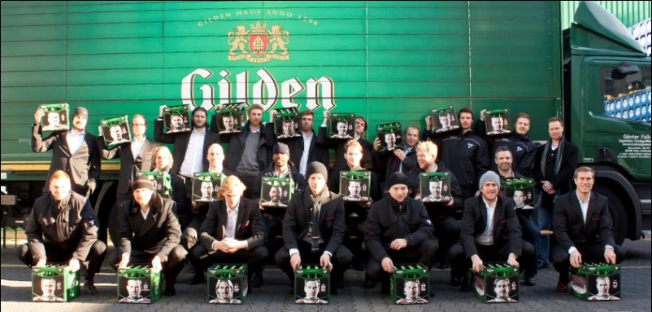 Die Haie haben diese Kästen bei einer Brauereiführung am Mittwoch bei Gilden signiert. Die Kasten-Banderolen sind mit Haie-Motiv gebrandet und begeistern sicher nicht nur Eishockey-Fans. Auf einer Längsseite jedes Kastens findet sich das Mannschaftsfoto des KEC, die gegenüber liegende Längsseite erhält ein Motiv mit dem Gilden Kölsch/KEC Partnerlogo. Auf der kurzen Kasten-Seite ist das Foto eines KEC Spielers sowie des Trainerteams zu sehen. Somit hat jedes Mitglied der Mannschaft einen eigenen Kasten Gilden Kölsch.