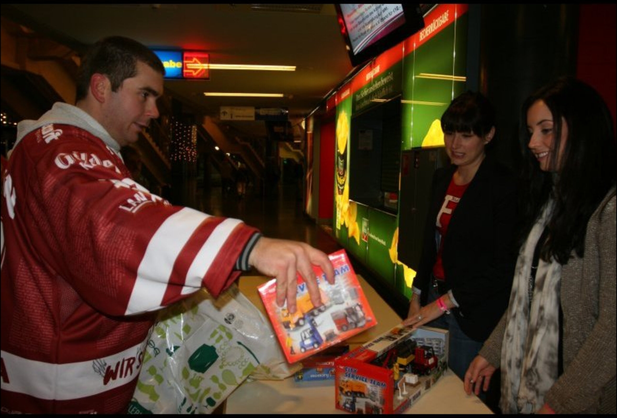 Auch diesmal blieb der Aufruf der Haie zur Spielzeug-Sammelaktion nicht ungehört. Viele Fans brachten Spielzeug an die Sammeltische im Foyer.