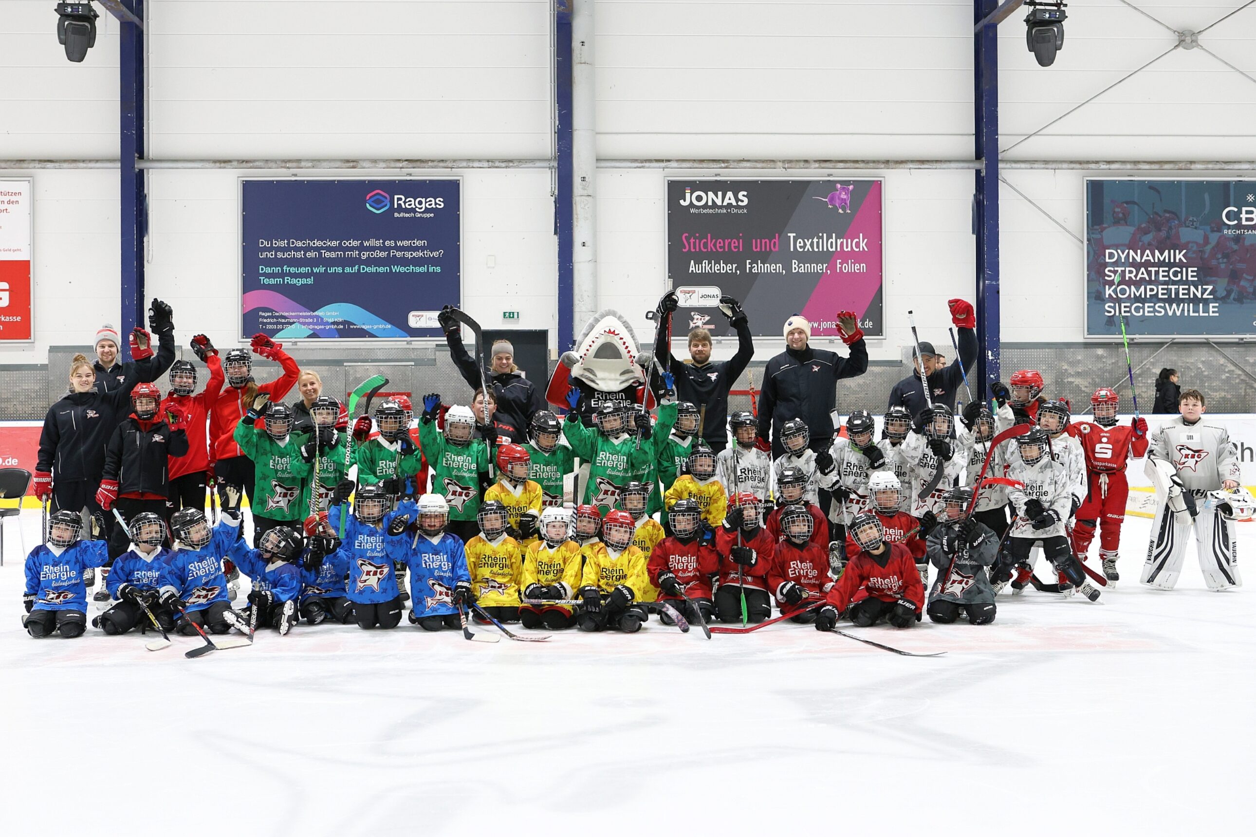 Verteidiger Veli-Matti Vittasmäki, Ex-Eishockey-Profi Shelby Bailen, Ehefrau unseres Verteidigers Nick Bailen, Sharky und zahlreiche Junghaie-Coaches waren als Unterstützung mit dabei – aber die Stars auf der Eisfläche im Haie-Trainingszentrum am vergangenen Samstagvormittag waren 46 Kinder, die mit ihren Bewerbungen für den „Kids on Ice“ Eishockey-Schnuppertag erfolgreich waren und bei der gemeinsamen Aktion von PENNY DEL und den Klubs ihre allerersten Schritte auf dem Eis machten.
