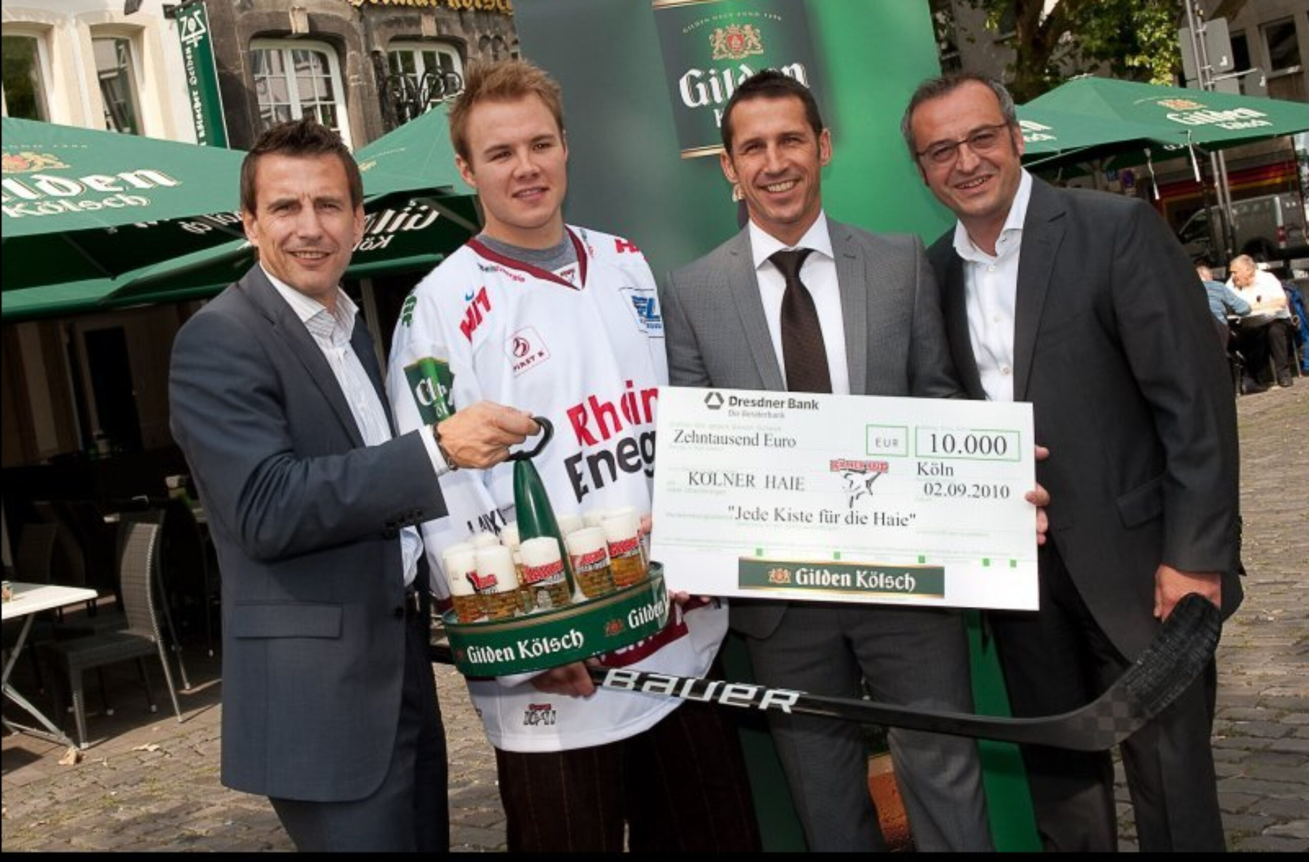 Bis zum Ende der Playoffs hatte „das Kölsch der Kölschen“ für jede verkaufte Kiste Gilden Kölsch jeweils zehn Cent dem KEC gutgeschrieben. Die damit erzielte Summe wurde ein wenig aufgerundet, so dass Gilden Kölsch den Kölner Haien jetzt noch einmal 10.000 Euro übergeben konnte. Die Scheckübergabe fand im Gilden im Zims, dem Stammhaus für die Marke Gilden Kölsch am Heumarkt, statt. Brett Breitkreuz, Stürmer der Kölner Haie und KEC-Geschäftsführer Thomas Eichin nahmen den Scheck entgegen.