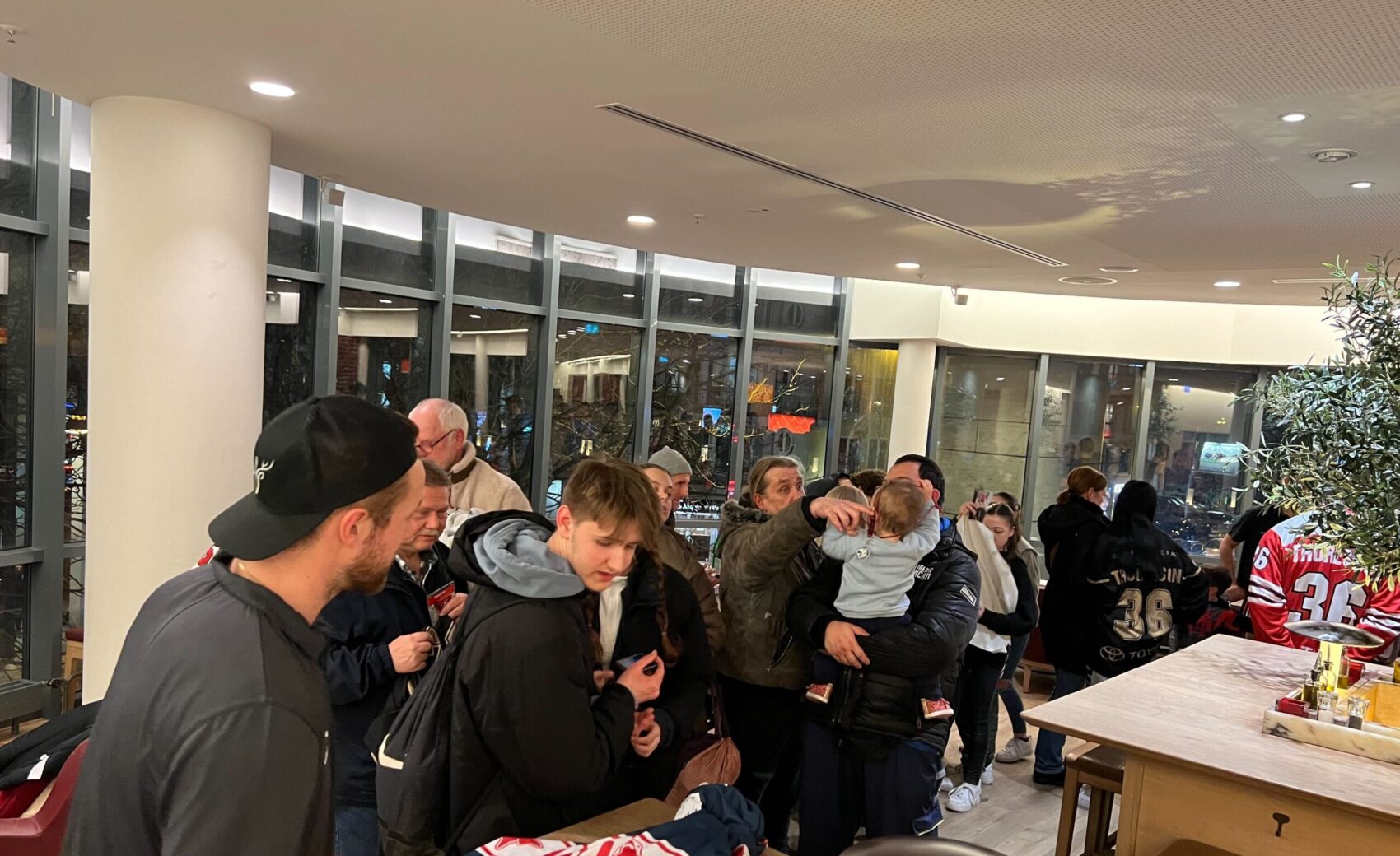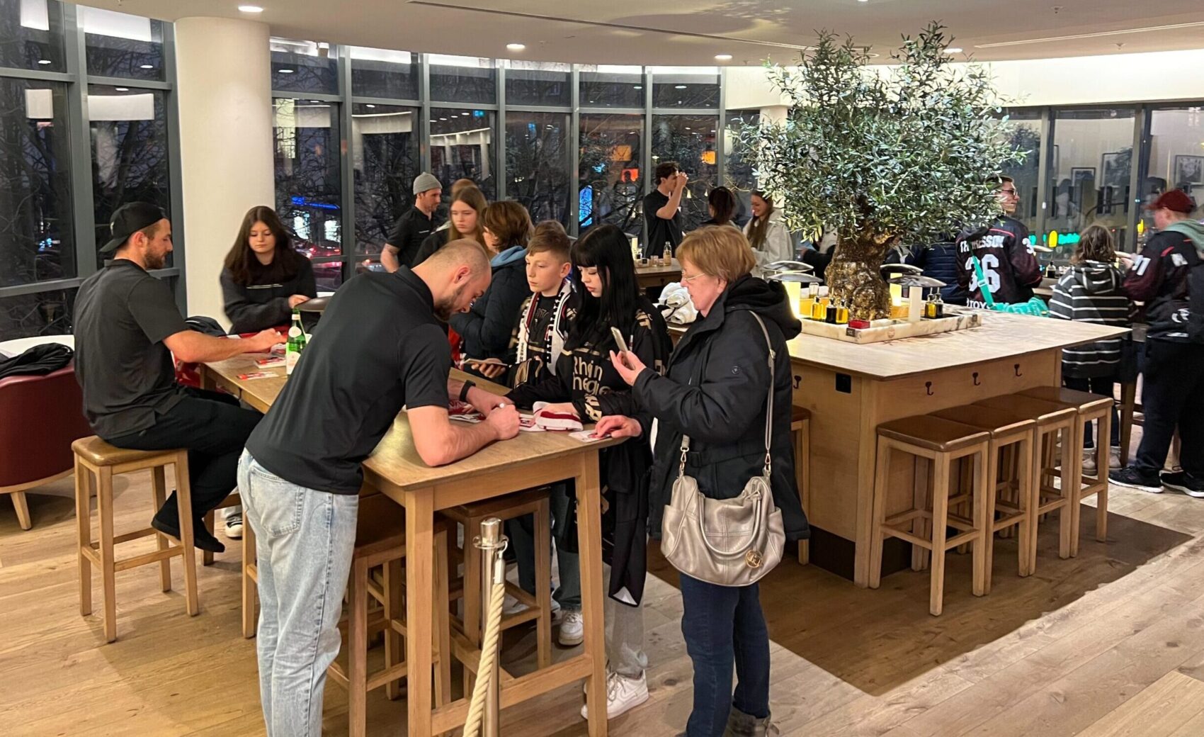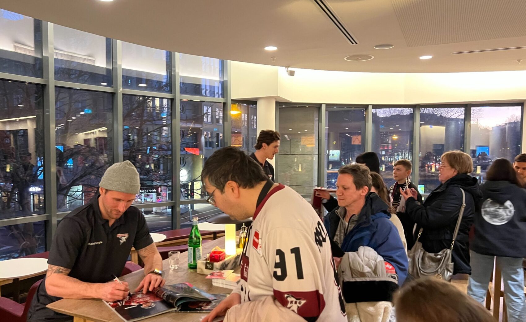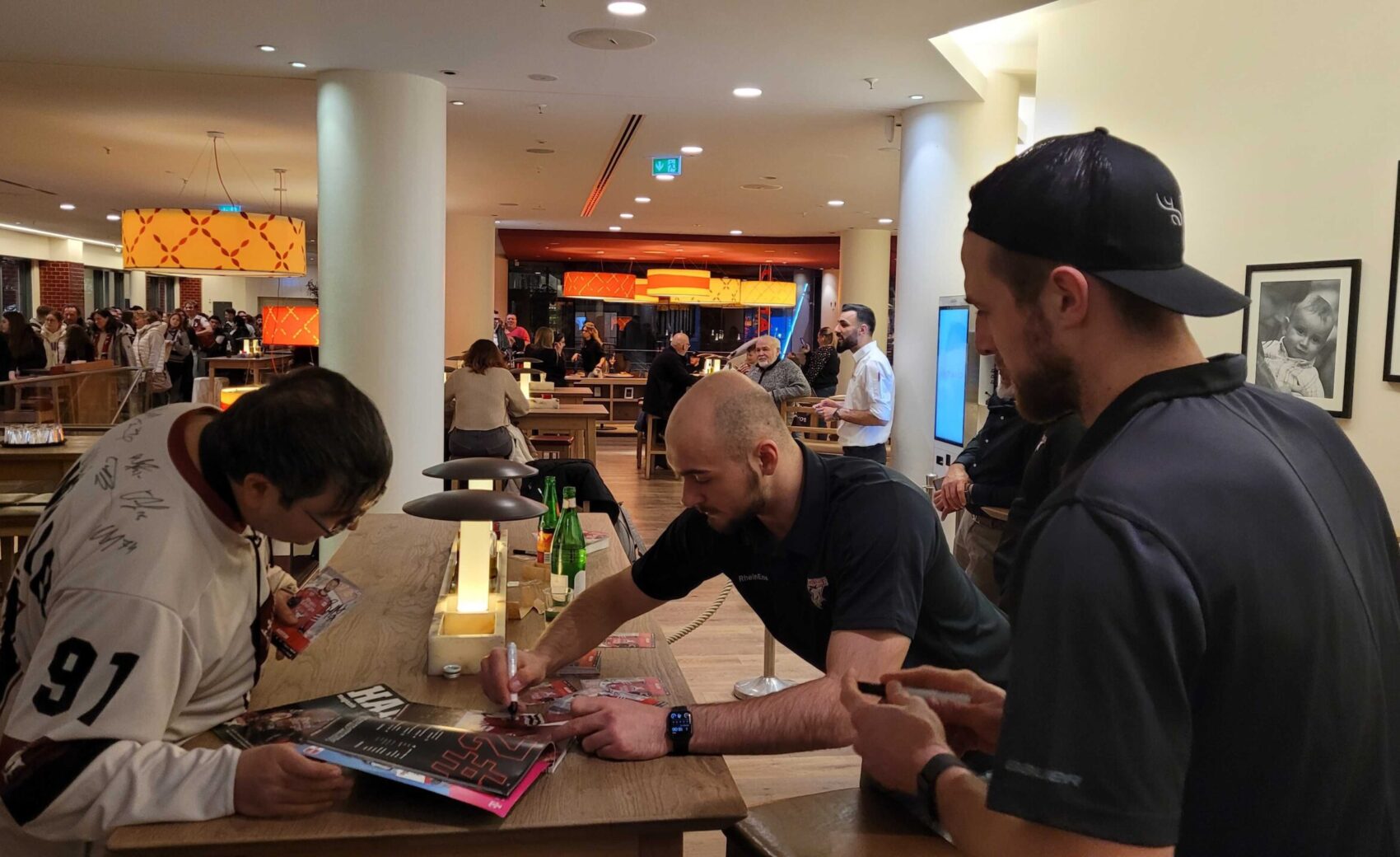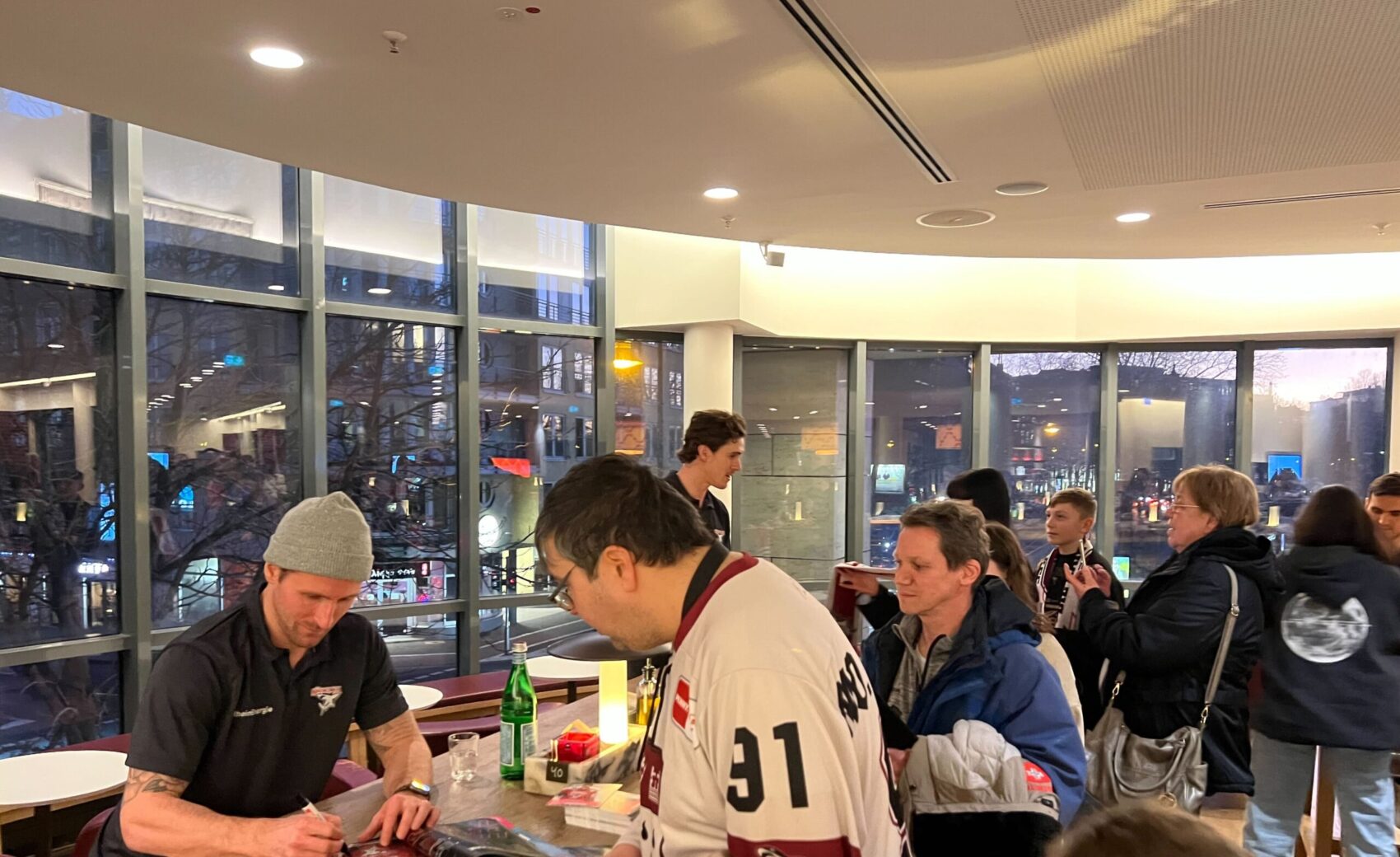 Volles Haus! Am gestrigen Mittwochabend luden wir gemeinsam mit unserem Partner Vapiano zur Autogrammstunde ins Vapiano Restaurant im Mediapark ein. Dem Aufruf folgten viele Haie-Fans, die im oberen Teil des Vapiano für großen Andrang sorgten.
