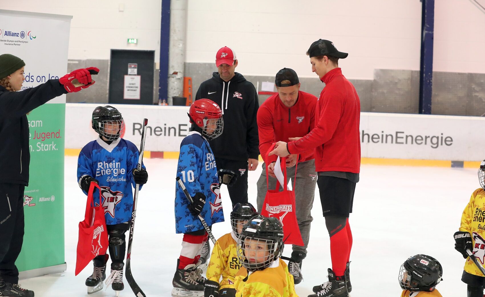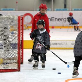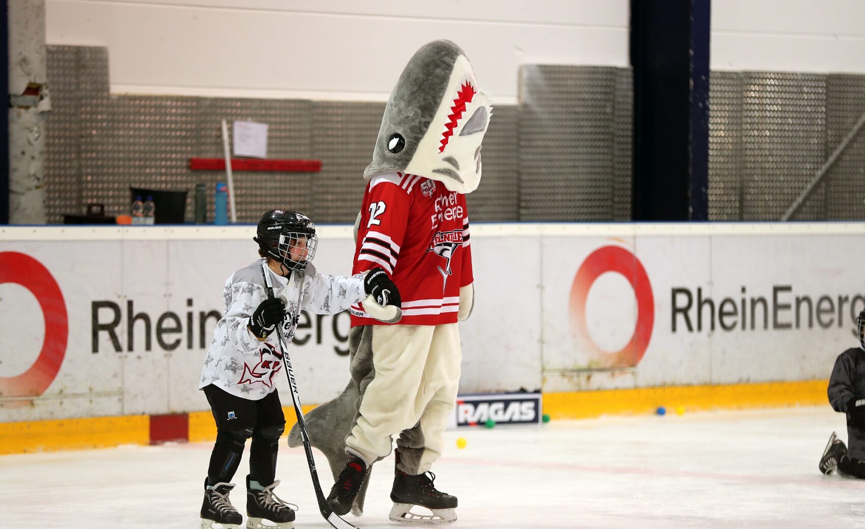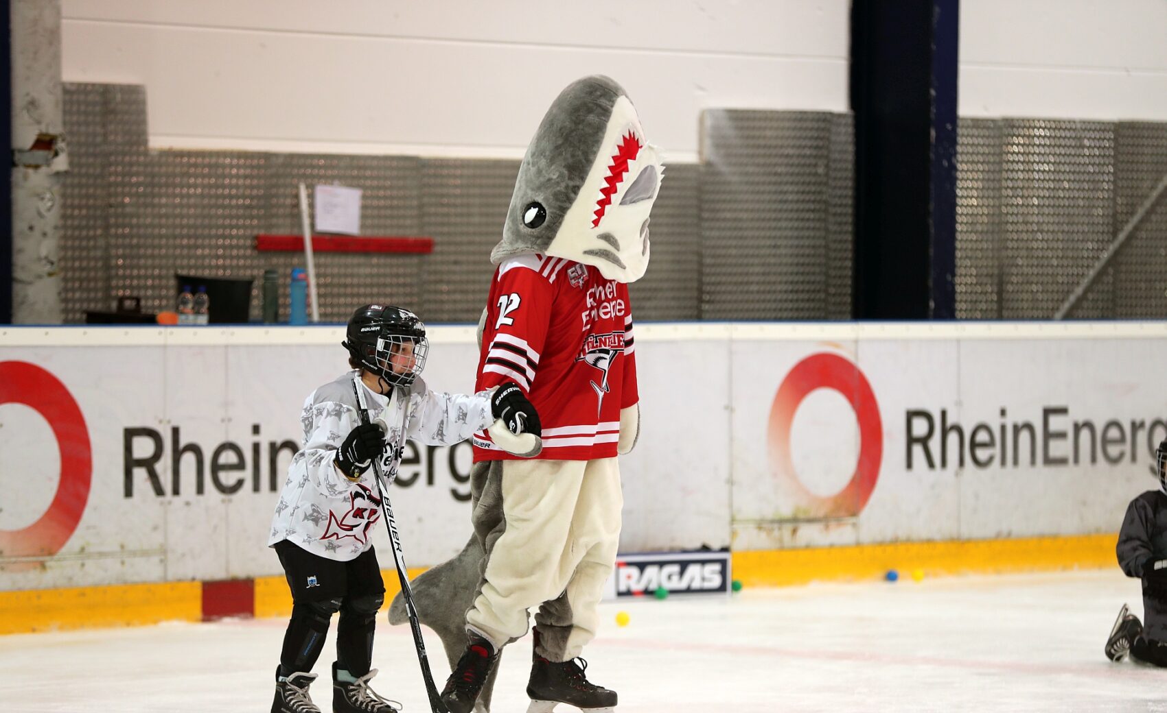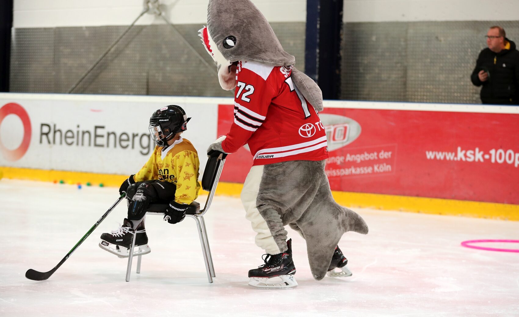 Nach Begrüßung und Ankleidung ging es für die vielen Kinder aufs Eis. Mit dabei waren Trainerinnen und Trainer der Junghaie, Haie-Maskottchen Sharky und die aktuellen Haie-Profis Moritz Müller, Jon Matsumoto und Julian Chrobot. Die Kinder, im Alter von vier bis acht Jahren, erlebten in einem spannenden und abwechslungsreichen Eishockey-Parcours die vielen Seiten des Eishockeysports.