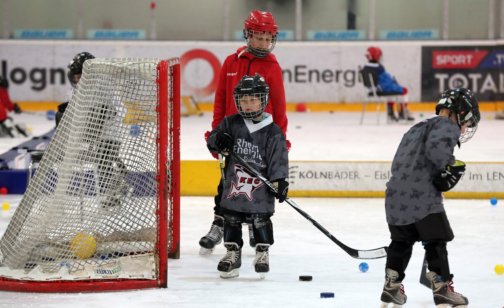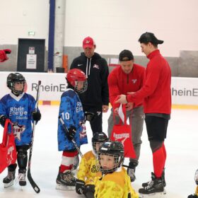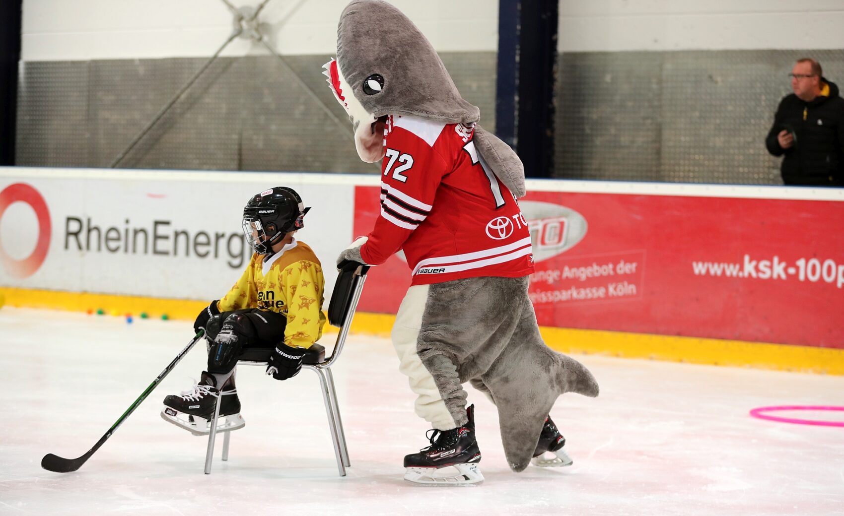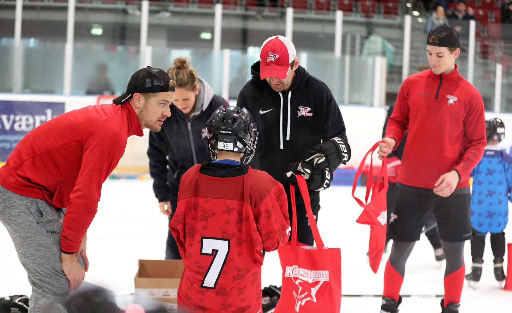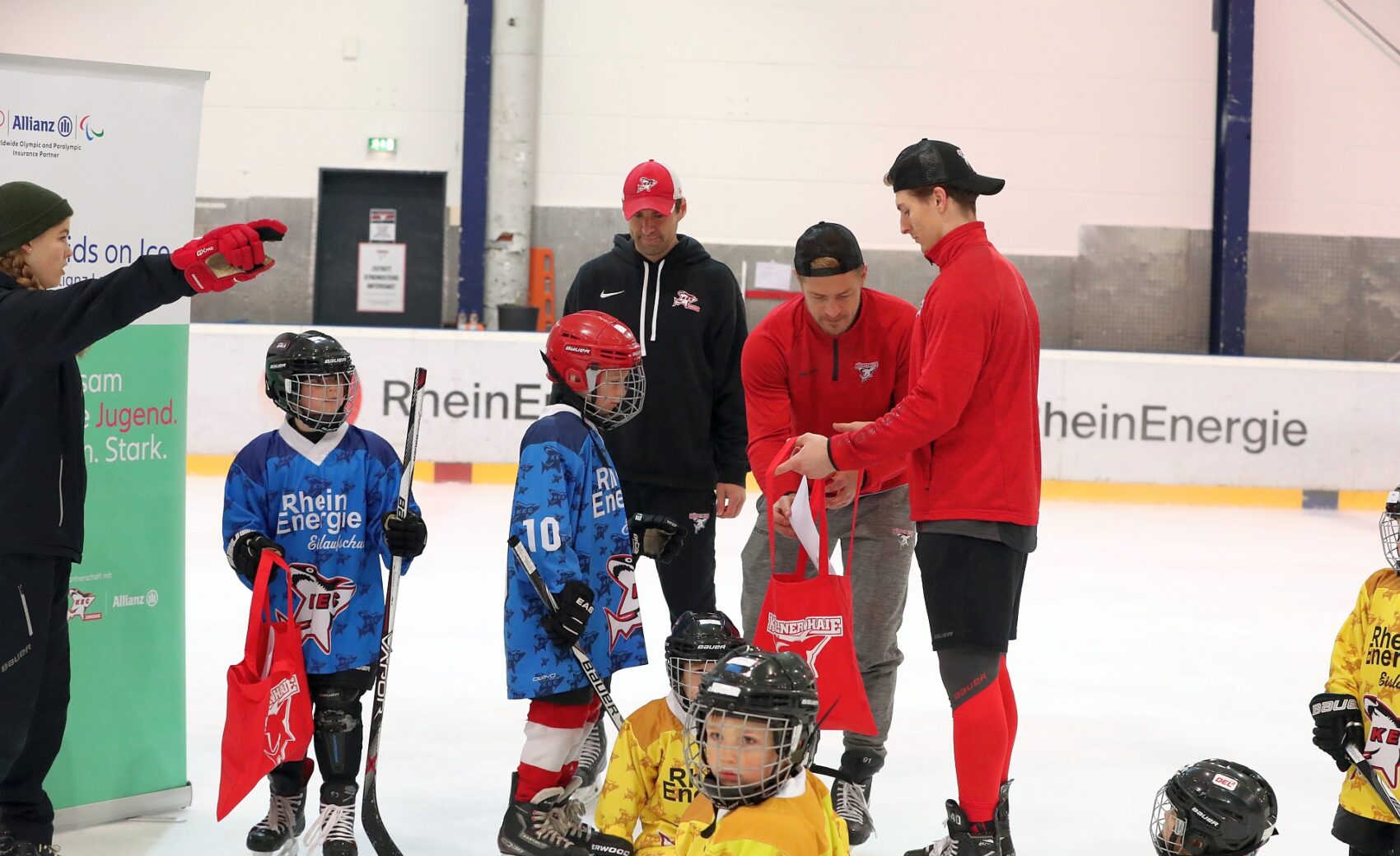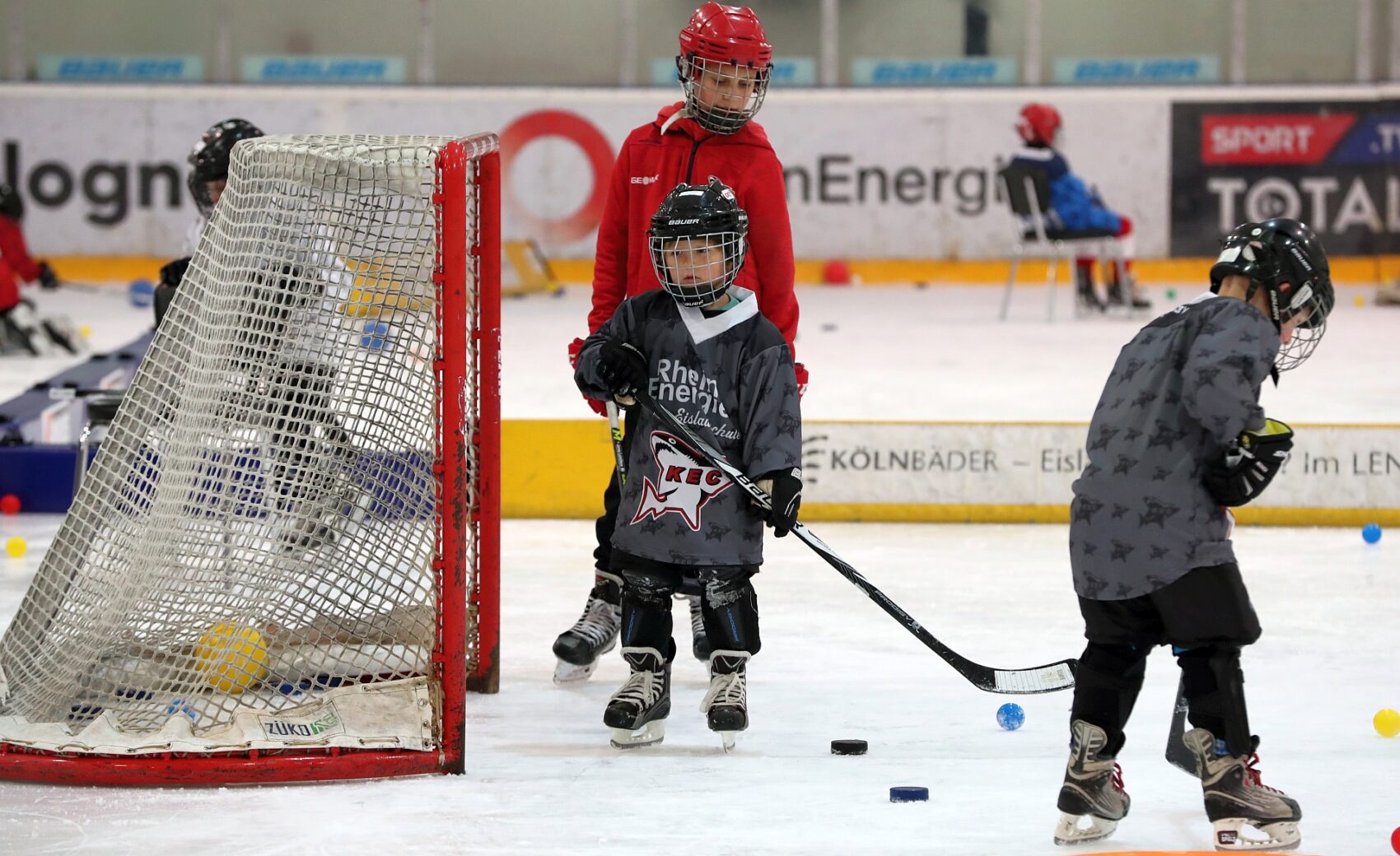 Nach Begrüßung und Ankleidung ging es für die vielen Kinder aufs Eis. Mit dabei waren Trainerinnen und Trainer der Junghaie, Haie-Maskottchen Sharky und die aktuellen Haie-Profis Moritz Müller, Jon Matsumoto und Julian Chrobot. Die Kinder, im Alter von vier bis acht Jahren, erlebten in einem spannenden und abwechslungsreichen Eishockey-Parcours die vielen Seiten des Eishockeysports.