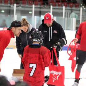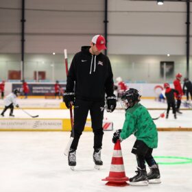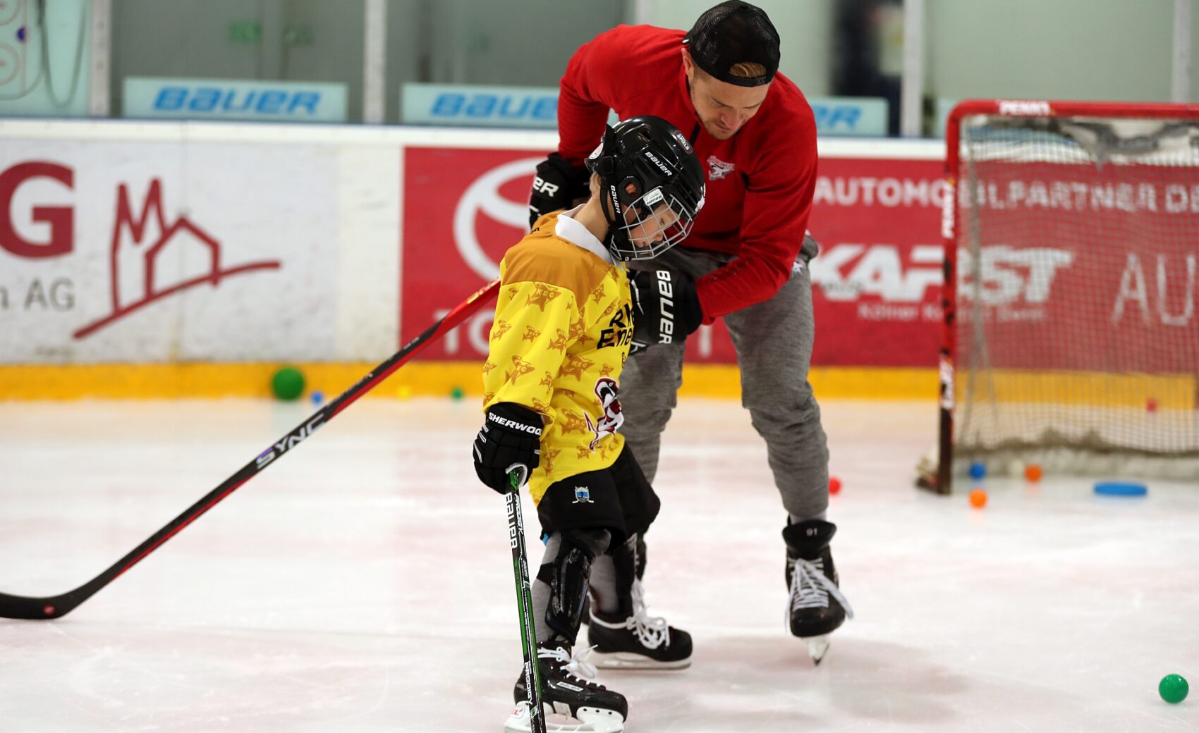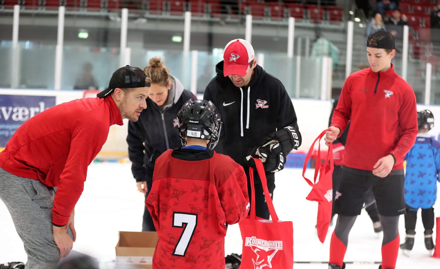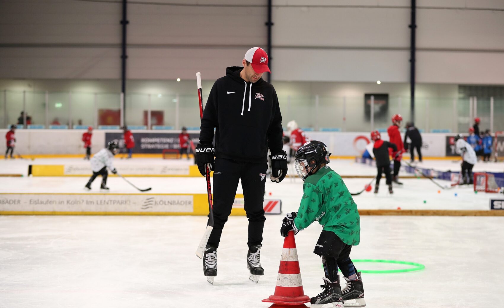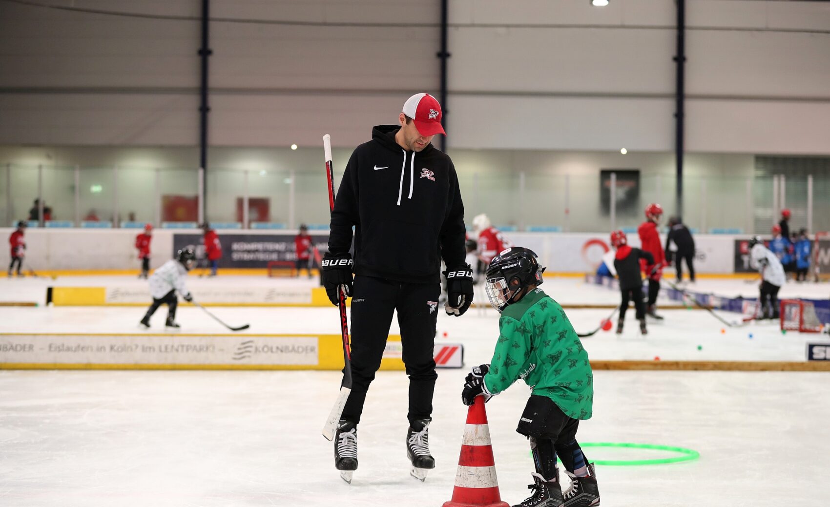 Nach Begrüßung und Ankleidung ging es für die vielen Kinder aufs Eis. Mit dabei waren Trainerinnen und Trainer der Junghaie, Haie-Maskottchen Sharky und die aktuellen Haie-Profis Moritz Müller, Jon Matsumoto und Julian Chrobot. Die Kinder, im Alter von vier bis acht Jahren, erlebten in einem spannenden und abwechslungsreichen Eishockey-Parcours die vielen Seiten des Eishockeysports.