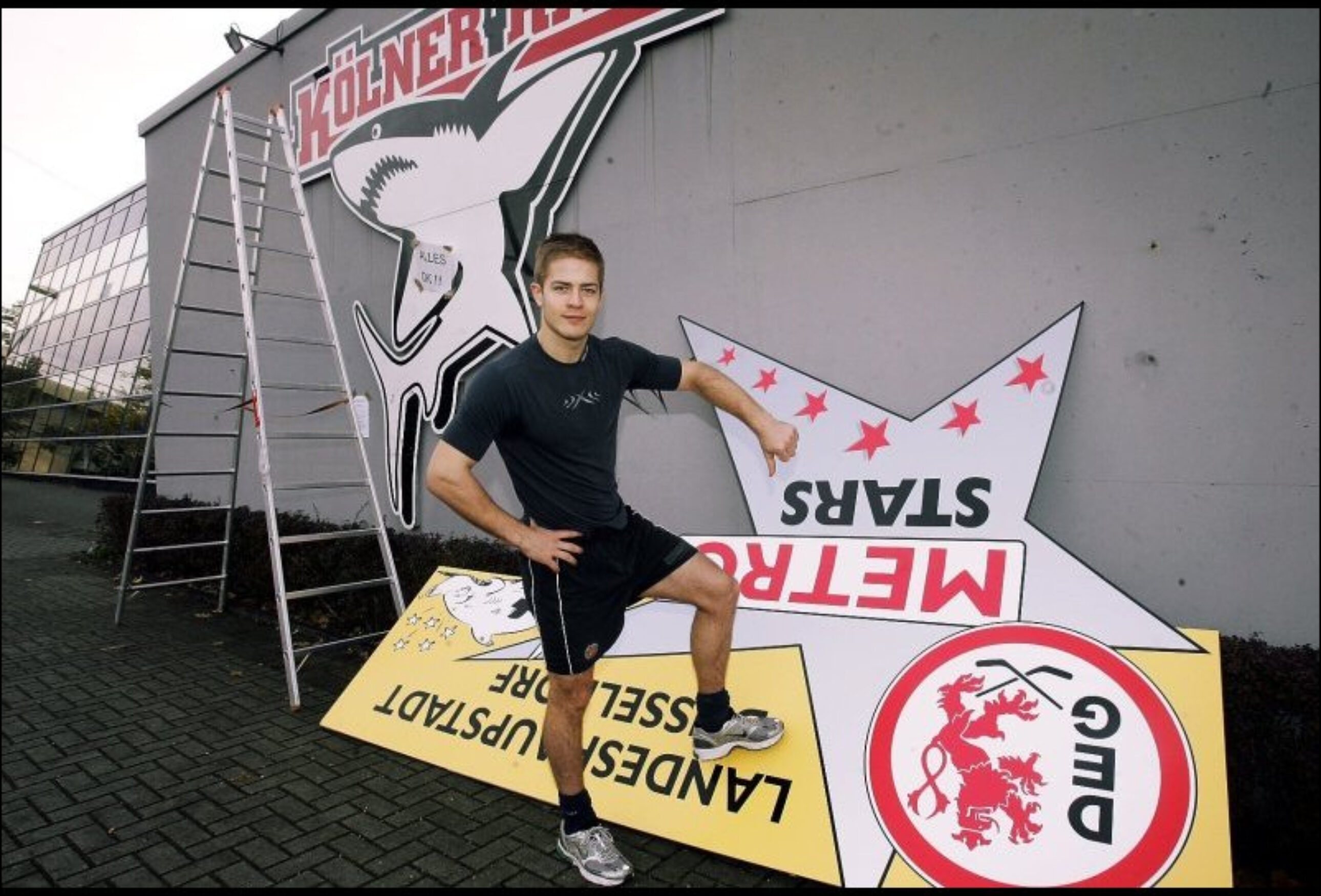 Die Haie nahmen´s sportlich – mussten aber natürlich umgehend reagieren. Haie-Verteidiger Moritz Müller entfernte das falsche Logo beherzt. Ein wenig Mitleid mit den Dorf-Bewohnern schwang hierbei mit, denn im Hinweis der DEG-Fans, dass das Dorf ja auch Landeshauptstadt sei, hatte sich ein fieser Tippfehler eingeschlichen. „Das konnte man nicht anders erwarten“, so Müller schmunzelnd.