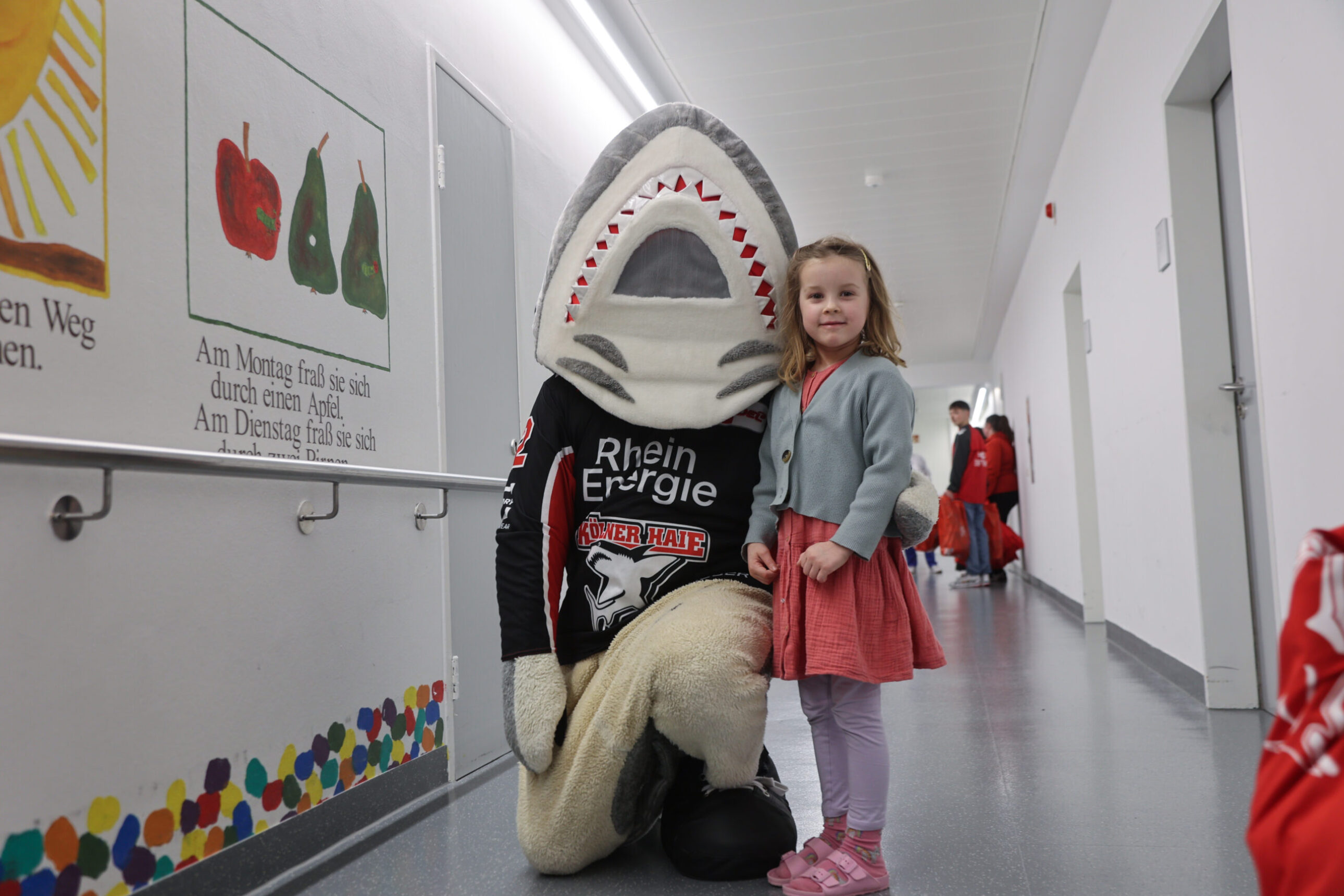Zusammen mit Vertretern des 1. FC Köln sowie Spielerinnen der KEC Frauen waren Geschäftsführer Philipp Walter, Haie-Legende Mirko Lüdemann, Gregor MacLeod sowie die Maskottchen beider Vereine – Sharky und Hennes – zu Gast im Kinderkrankenhaus und verteilten dort jede Menge Präsente an die jungen Patienten. Vom FC waren drei Profis (Dejan Ljubicic, Timo Hübers sowie Marvin Obuz) und Mitglieder der FC-Stiftung dabei.