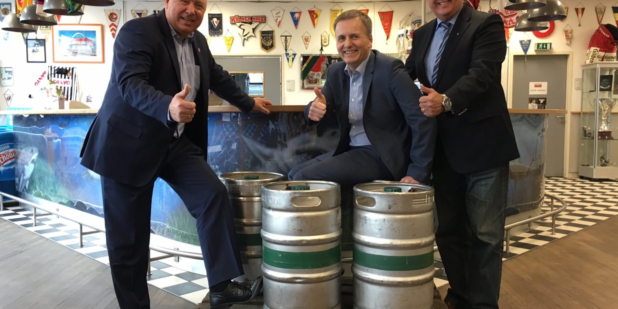 Zum Erreichen der ersten Playoff-Runde gratulierten Bürgermeister Hans-Werner Bartsch (im Bild rechts) sowie der 1. Vorsitzende des Colonia Kochkunstvereins, Ernst Vleer (l.), und spendierten dem KEC 200 Liter leckeres Kölsch. Haie-Geschäftsführer Peter Schönberger (M.) freute sich: „Wir bedanken uns für die Unterstützung in flüssiger Form von zwei höchst engagierten Haie-Fans.“