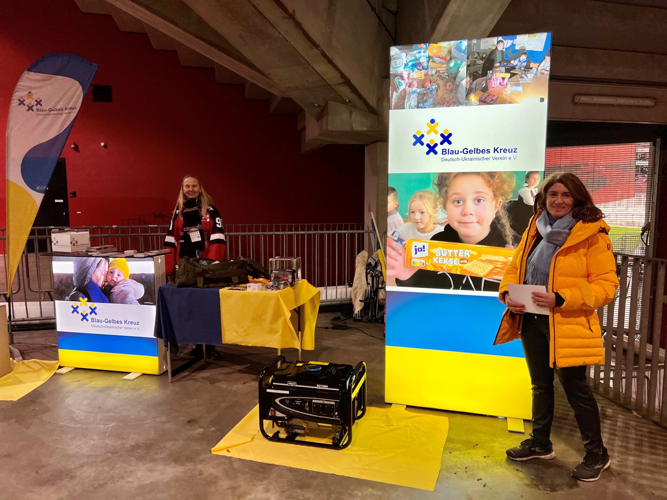 Die Haie unterstützen den deutsch-ukrainischen Verein Blau-Gelbes Kreuz. Ihn gibt es bereits seit 2014, mit Kriegsbeginn leistet er humanitäre Hilfe in der Ukraine: Derzeit liefert der Verein von Köln aus Babysachen für Neugeborene, medizinisches Erste-Hilfe-Material für Verwundete und aktuell Wintersachen und Notstromaggregate.