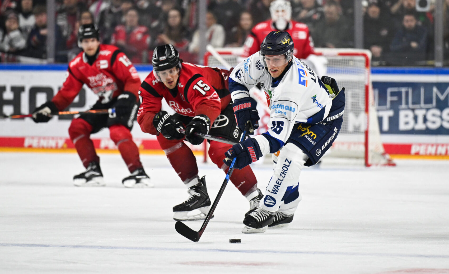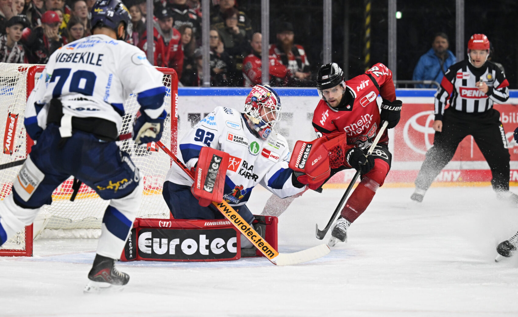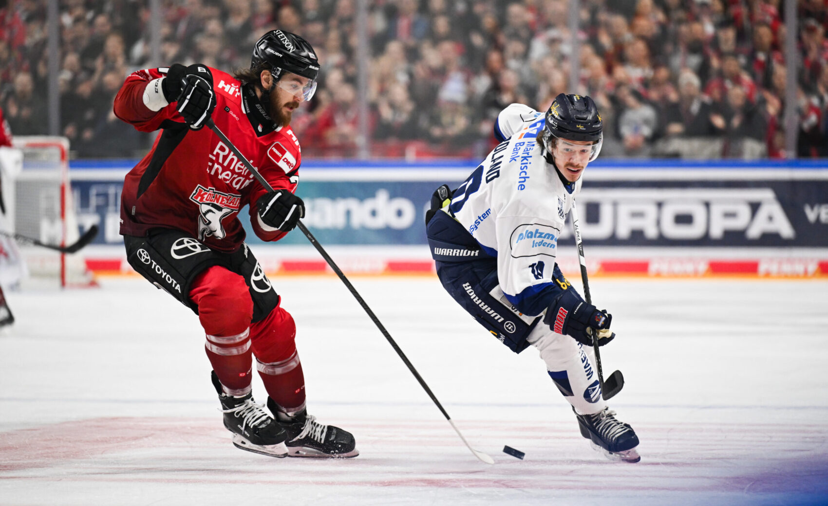 Die Gäste aus dem Sauerland erwischten vor 18.600 Zuschauern im ausverkauftem Haifischbecken den besseren Start und hatten durch Daniel Fischbuch die erste Chance der Partie (2.). Oliwer Kaski meldete zwei Minuten später unsere Offensivbemühungen an, setzte seinen Schlagschuss aber knapp den Kasten. Auf der Gegenseite hätte Christian Thomas den IEC beinahe in Führung gebracht, scheiterte im Eins gegen Eins aber an Janne Juvonen (4.).