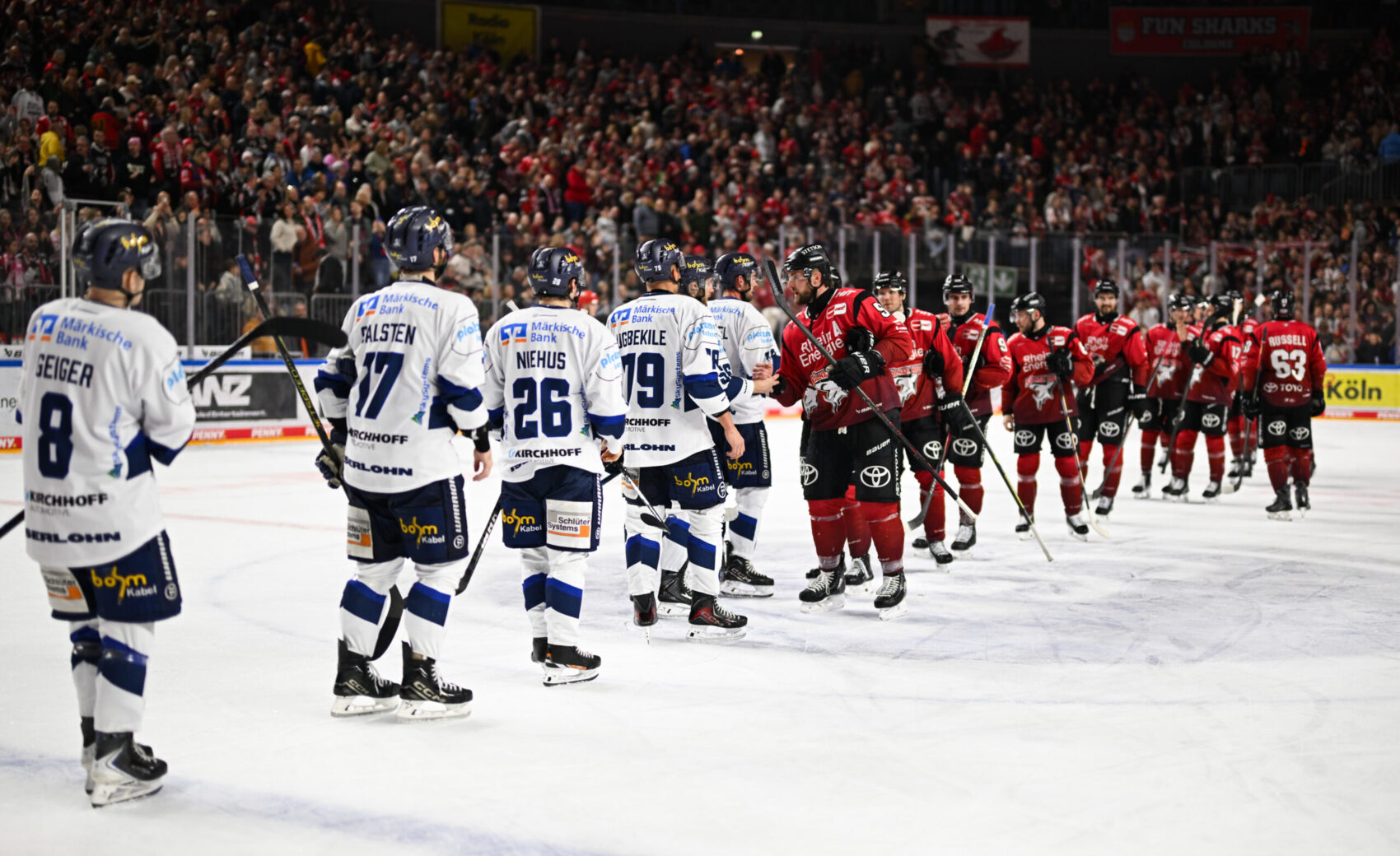 Wir können unser Heimspiel gegen die Iserlohn Roosters in einem engen NRW-Duell erfolgreich gestalten und gewinnen die Partie mit 4:2. Dominik Bokk, Nate Schnarr, Louis-Marc Aubry sowie Patrick Russell schießen unsere Tore. Hinten hält Janne Juvonen zusammen mit einer konzentrierten Defensive den Laden so gut es geht dicht, sodass wir trotz vieler Iserlohner Abschlüsse die Oberhand behalten – und das zum 14. Mal in der PENNY DEL in Folge.