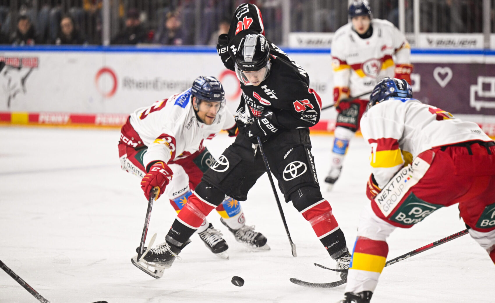 Das zweite Drittel war nicht mal eine Minute alt, da konnten die Düsseldorfer ausgleichen. Kyle Cumiskey fand in unserer Defensive eine Lücke, zog Richtung Julius Hudacek und schloss cool zum Ausgleich ab (21.). Nach 26 Minuten holten wir uns jedoch die Führung zurück – im Powerplay blieben wir nach mehreren gescheiterten Versuchen hartnäckig. Am langen Pfosten kam Parker Tuomie zum Abschluss und setzte die Scheibe am machtlosen Haukeland vorbei ins DEG-Tor.
