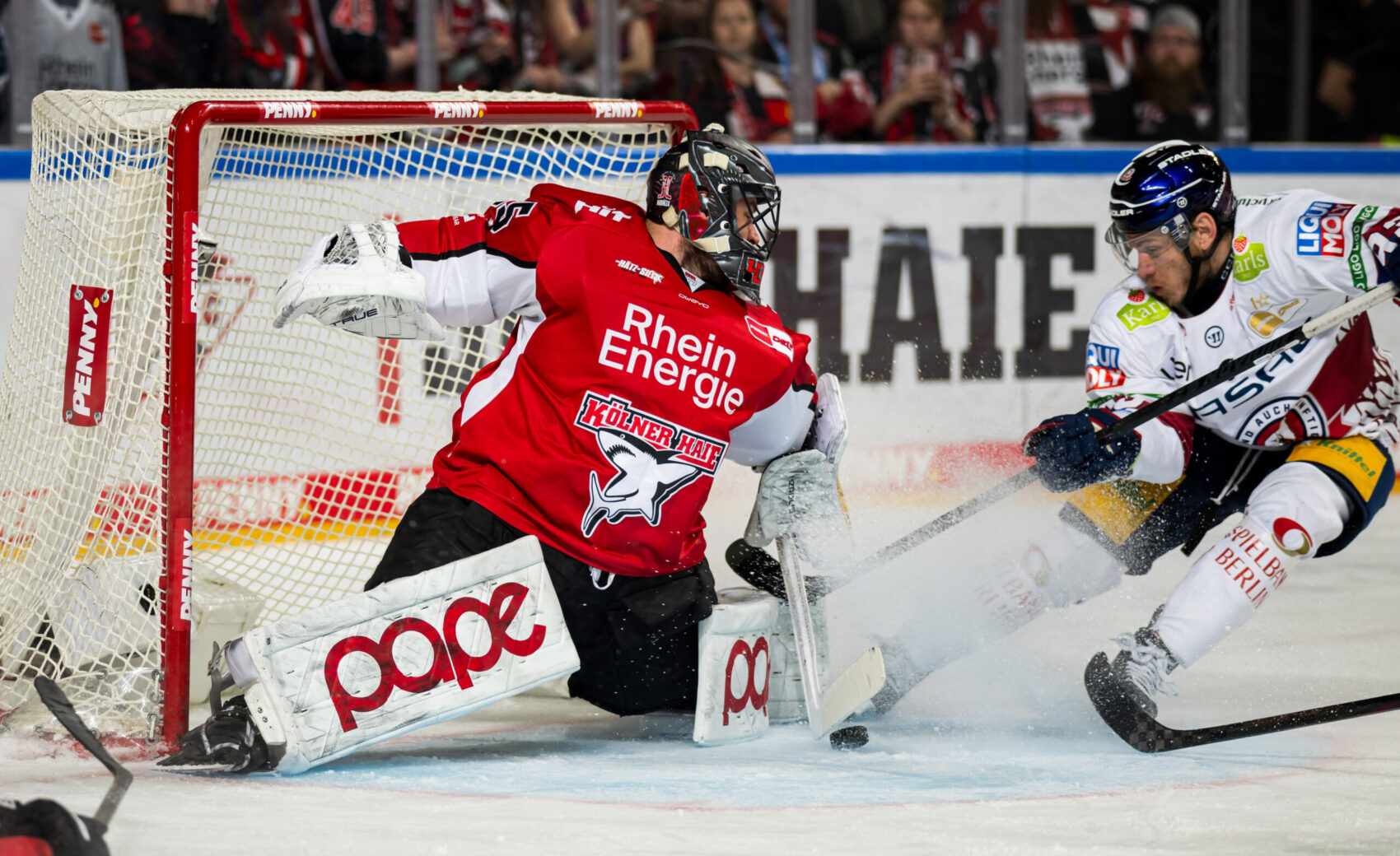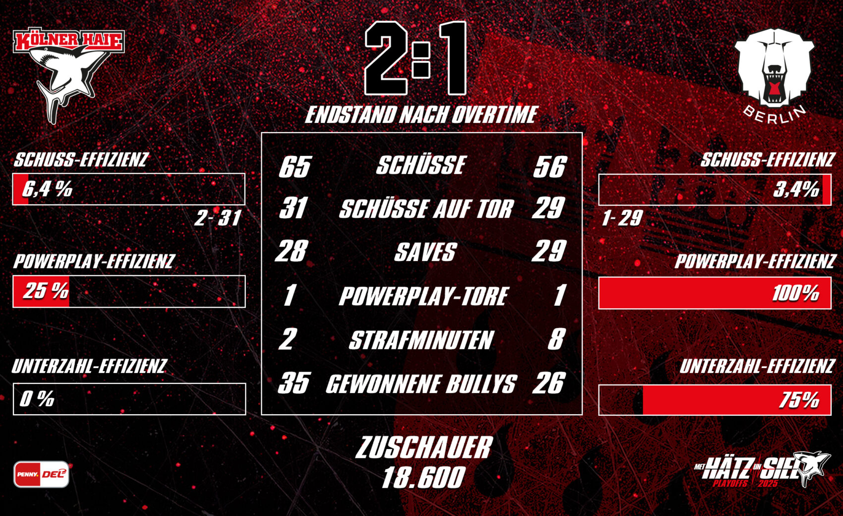 Wir konnten uns in der Folgezeit gute Möglichkeiten erspielen, diese jedoch nicht in Tore ummünzen. Immer wieder war Hildebrand Endstation – die beste Phase erwischten wir in Folge zweier Strafen unmittelbar hintereinander der Berliner wenige Minuten vor Ablauf der regulären Spielzeit, sodass wir für gut 50 Sekunden sogar in doppelter Überzahl spielen konnten. Dort konnten wir die sich uns bietenden Chancen jedoch nicht nutzen. Mit dem letzten Angriff nahm Berlin-Angreifer und Ex-Hai Frederik Tiffels nochmal seine Kufen in die Hand und zog mit Geschwindigkeit von links in unsere Zone. Kurz vor unserem Tor brachte der deutsche Nationalspieler die Scheibe mit der Rückhand gefährlich in den Slot, wo Freund und Feind verpassten. Da dies wenige Sekunden vor dem Ablauf des dritten Drittels und daraufhin nichts mehr passierte, musste die Overtime herhalten.
