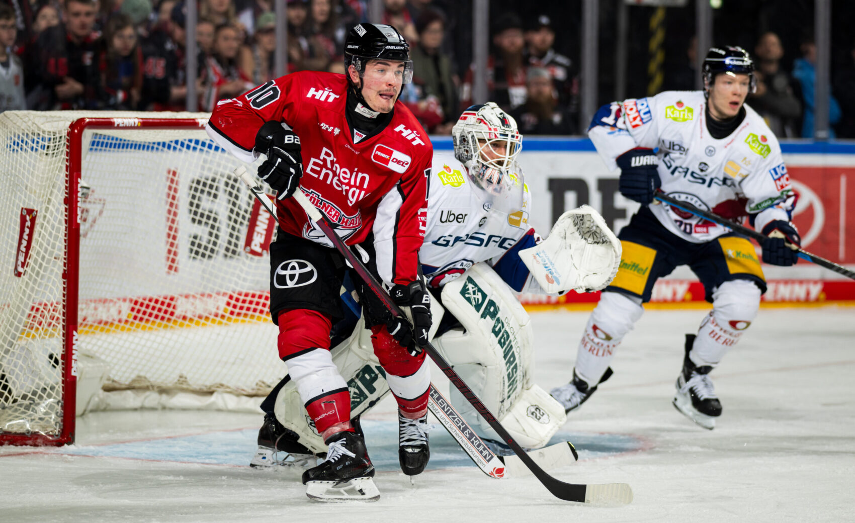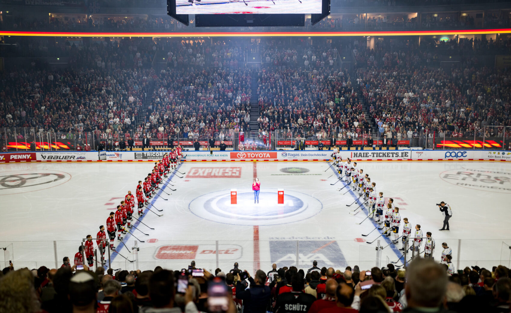 Beide Fanlager würdigten ihre Teams kurz vor dem Puckdrop mit Choreos, was dem stimmungsvollen Abend in der ausverkauften LANXESS arena einen würdigen Rahmen gab. Gleich mit Start des Spiels drückten wir ordentlich auf das Gaspedal und konnten uns nach nicht einmal 60 Sekunden gleich zwei Torchancen erspielen, die die Gäste aus der Hauptstadt aber auch dank guter Saves ihres Goalies Jake Hildebrand entschärfen konnten.