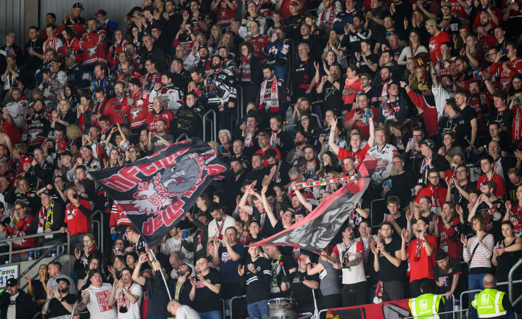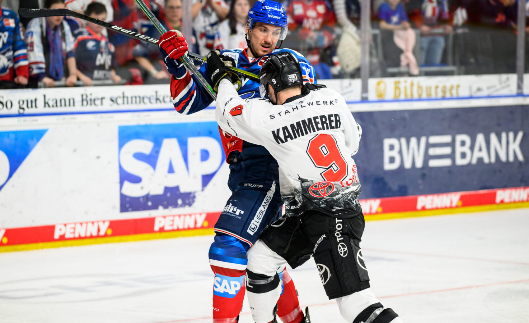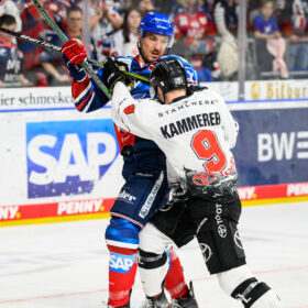 Der KEC gewinnt Spiel 3 der Playoff-Viertelfinalserie gegen die Adler aus Mannheim dank eines Treffers von David McIntyre in der zweiten Overtime mit 3:2! Bis das entscheidende Tor um 22:24 Uhr in der ausverkauften SAP Arena fällt, ist es ein leidenschaftlich geführtes Eishockey-Spiel zwischen zwei starker Teams. Mit dem besseren Ende für die Haie, die dank des Erfolges in der Serie nun mit 2:1 führen.