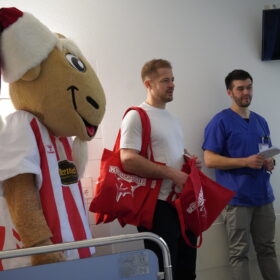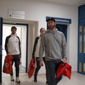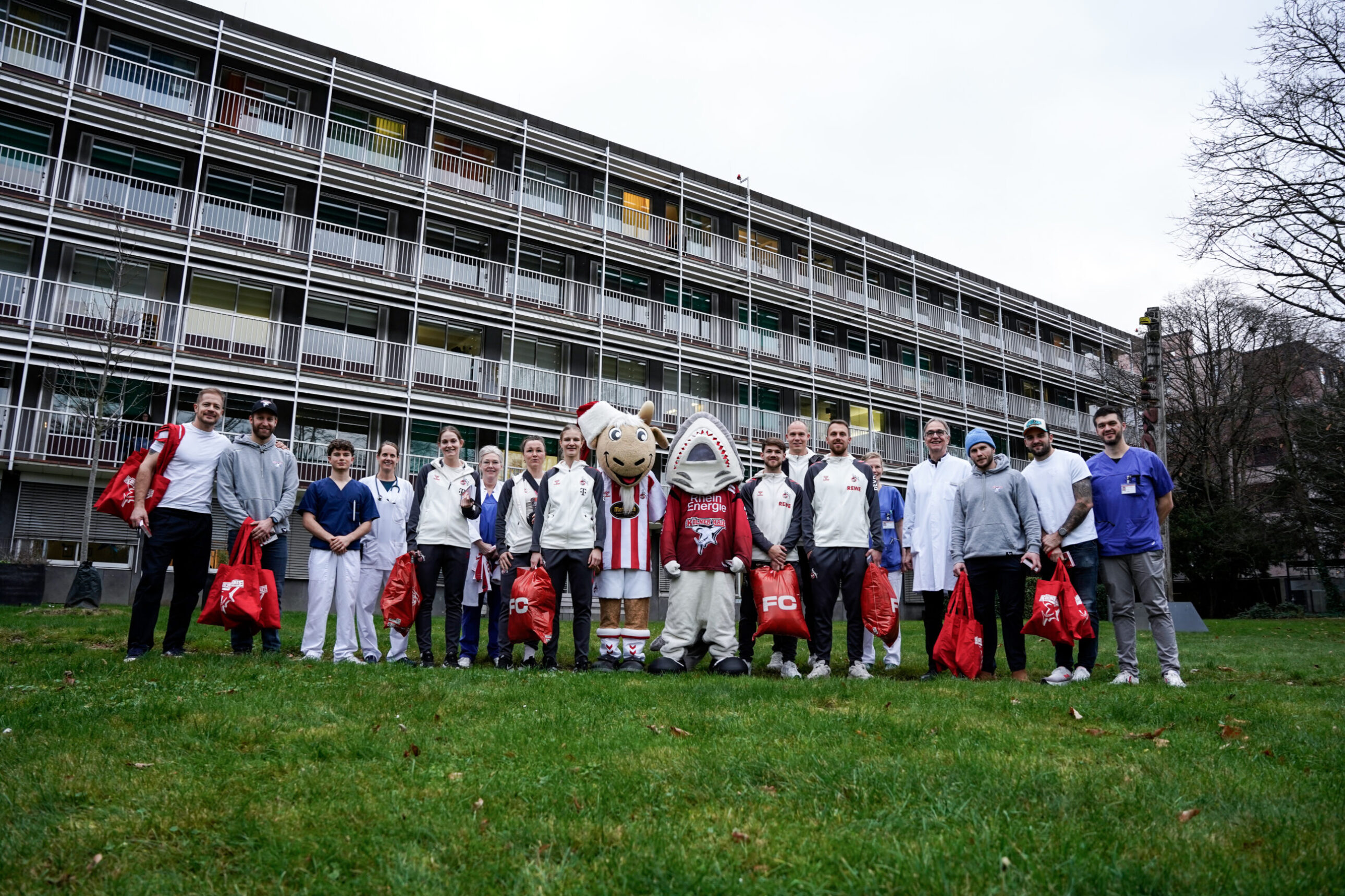 Auch in diesem Jahr besuchten wir gemeinsam mit den Fußballern und Fußballerinnen des 1. FC Köln die Klinik. Während unser Club mit Kapitän Moritz Müller, Parker Tuomie, Felix Brückmann und Dominik Uher vor Ort war, wurde der Effzeh u.a. durch Marvin Schwäbe, Jan Thielmann und Marina Hegering vertreten. Natürlich durften auch Maskottchen Sharky und der Pänz-Club Hennes nicht fehlen, die für viele Kinder das Highlight des Tages war.