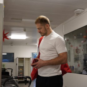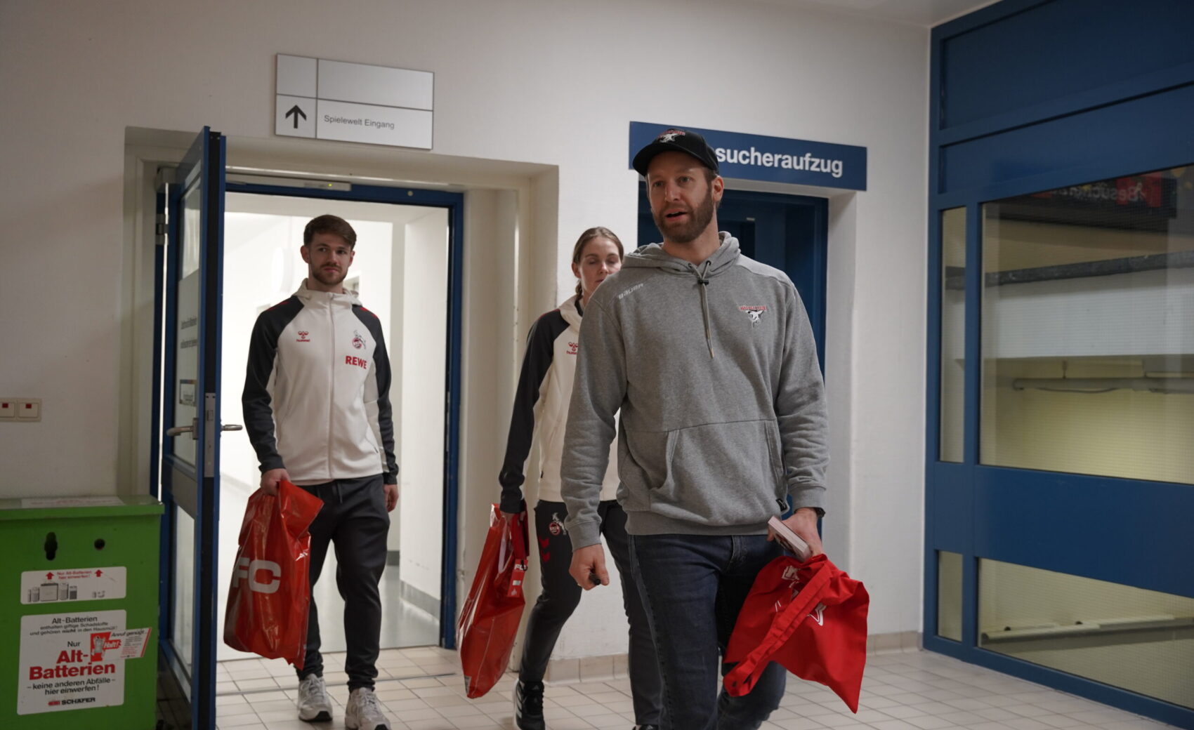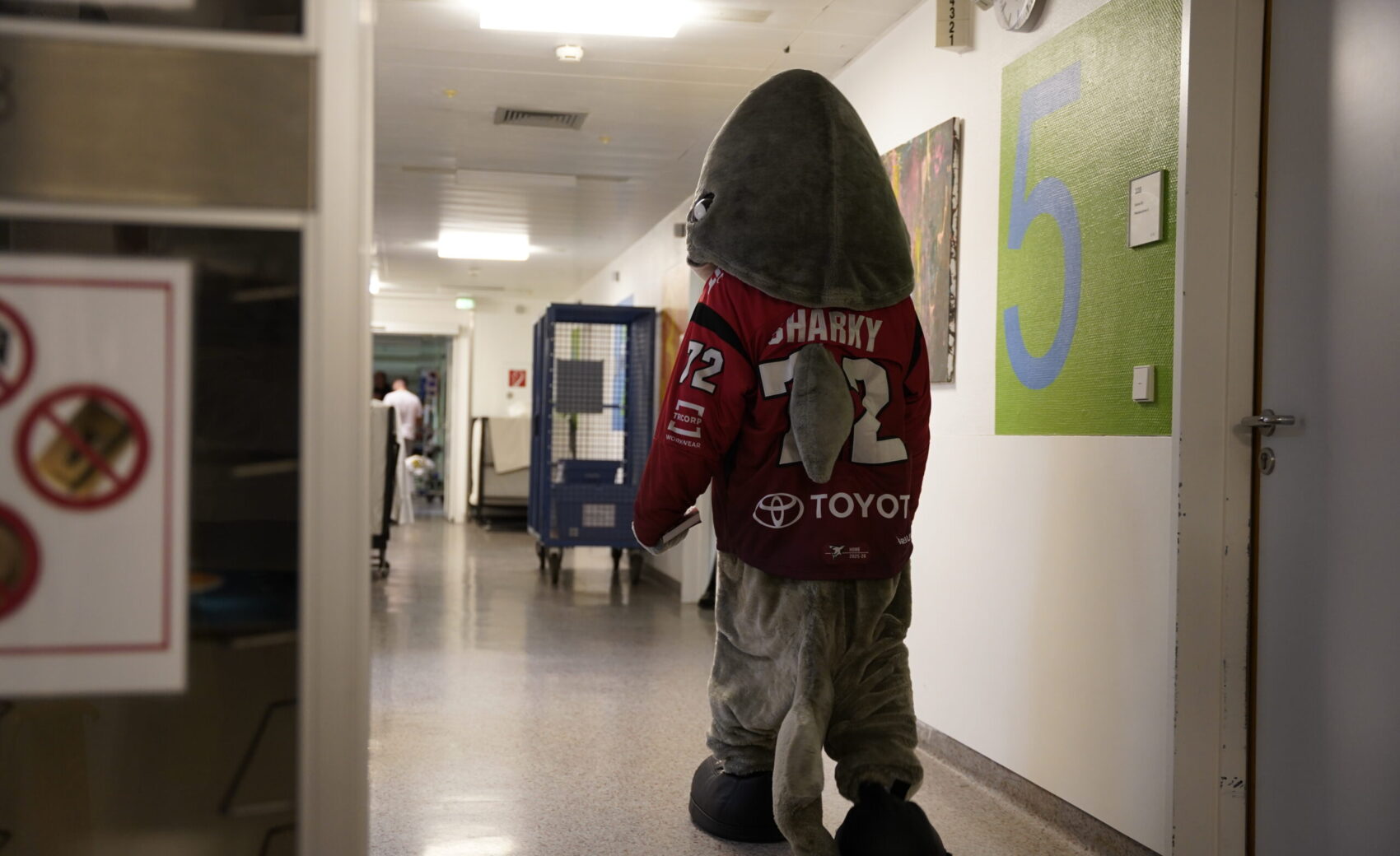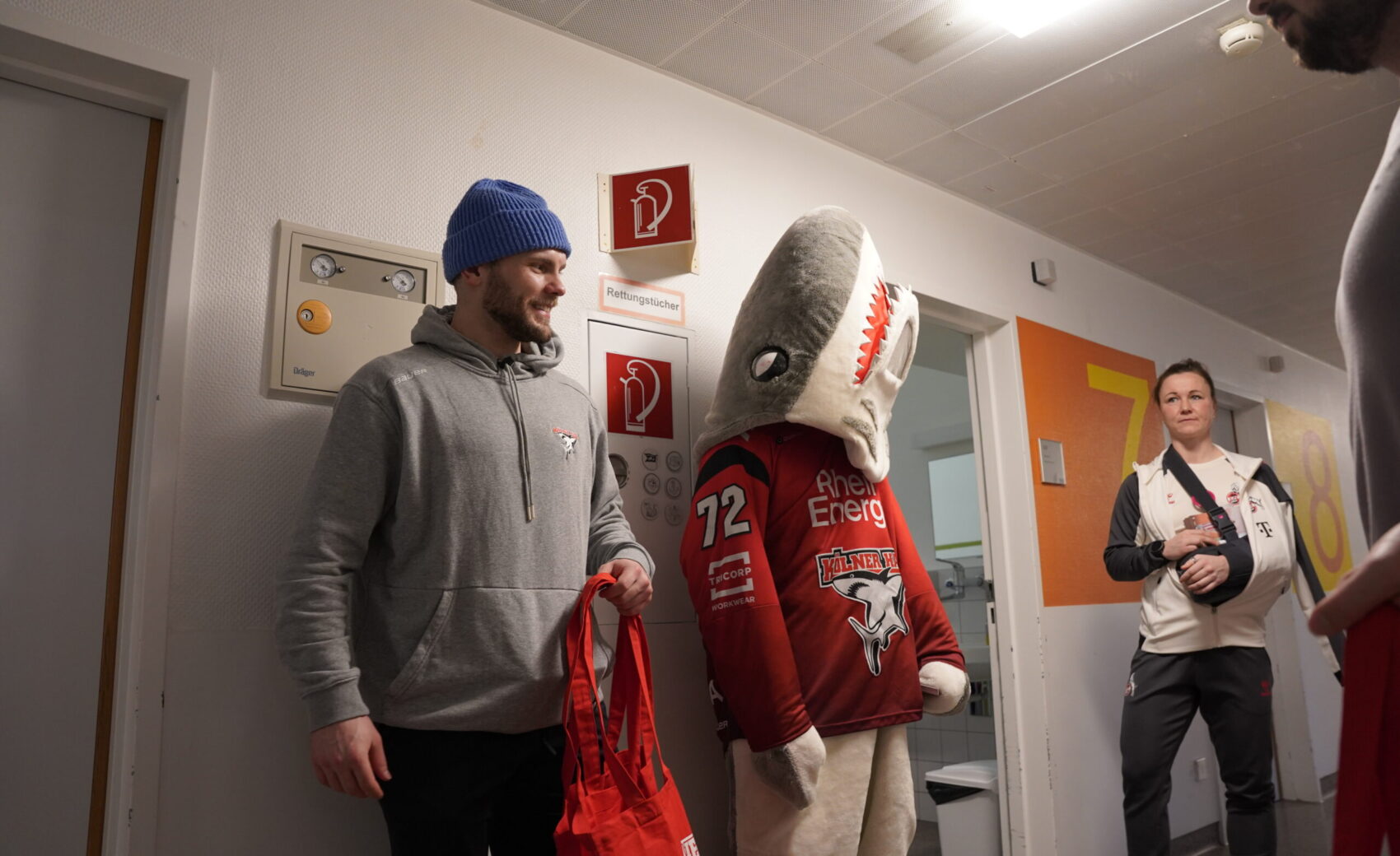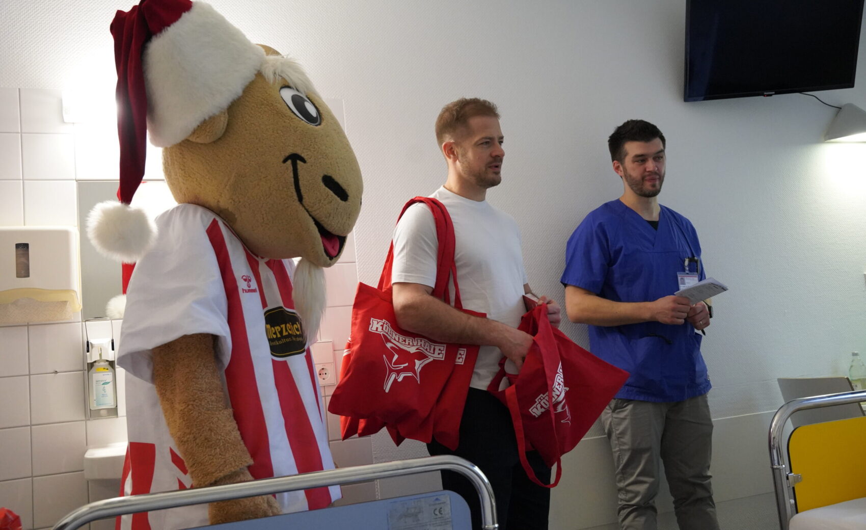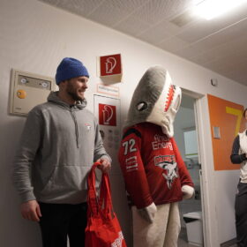 Am Mittwochnachmittag stand für uns wieder ein ganz besonderer Termin im Kalender: der alljährliche Besuch im Kinderkrankenhaus an der Amsterdamer Straße. Seit vielen Jahren ist dieser Termin fester Bestandteil unserer Adventszeit – und berührt alle Beteiligten jedes Mal aufs Neue. Im Mittelpunkt standen dabei wieder die jungen Patientinnen und Patienten, denen wir gemeinsam mit unseren Fans ein wenig Freude und Ablenkung in der Vorweihnachtszeit schenken durften. Dank beeindruckender Unterstützung aus der Haie-Familie konnten wir fast 500 Charity-Taschen überreichen, die im Vorfeld von euch erworben worden waren.