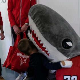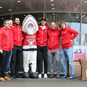 Dass Sharky, der ebenfalls mit dabei war, unseren Jungs bei dem Besuch im Kinderkrankenhaus ein wenig die Show stahl, war für alle Beteiligten mehr als nur in Ordnung. „Wir hatten Sharky mit dabei, da sind die Kinder zusammen mit ihren Mini-Sharkys, die wir verteilt haben, sehr glücklich gewesen. Es hat uns als Gruppe sehr viel Spa gemacht“, so Wohlgemuth stellvertretend für die Gruppe – für den im Sommer zu uns gewechselten Angreifer war es der erste Besuch dieser Art im Kinderkrankenhaus.