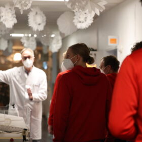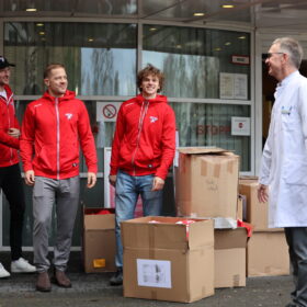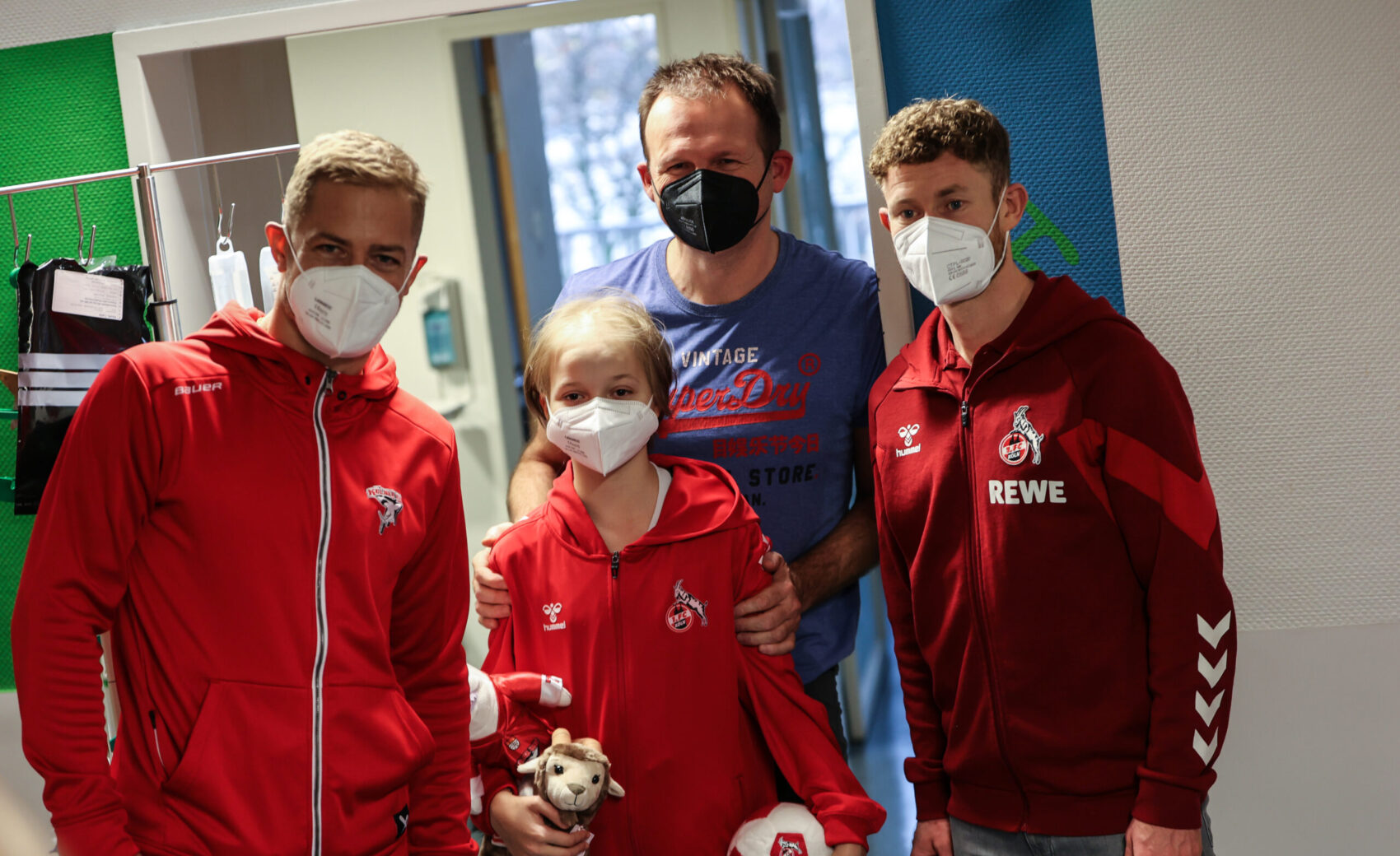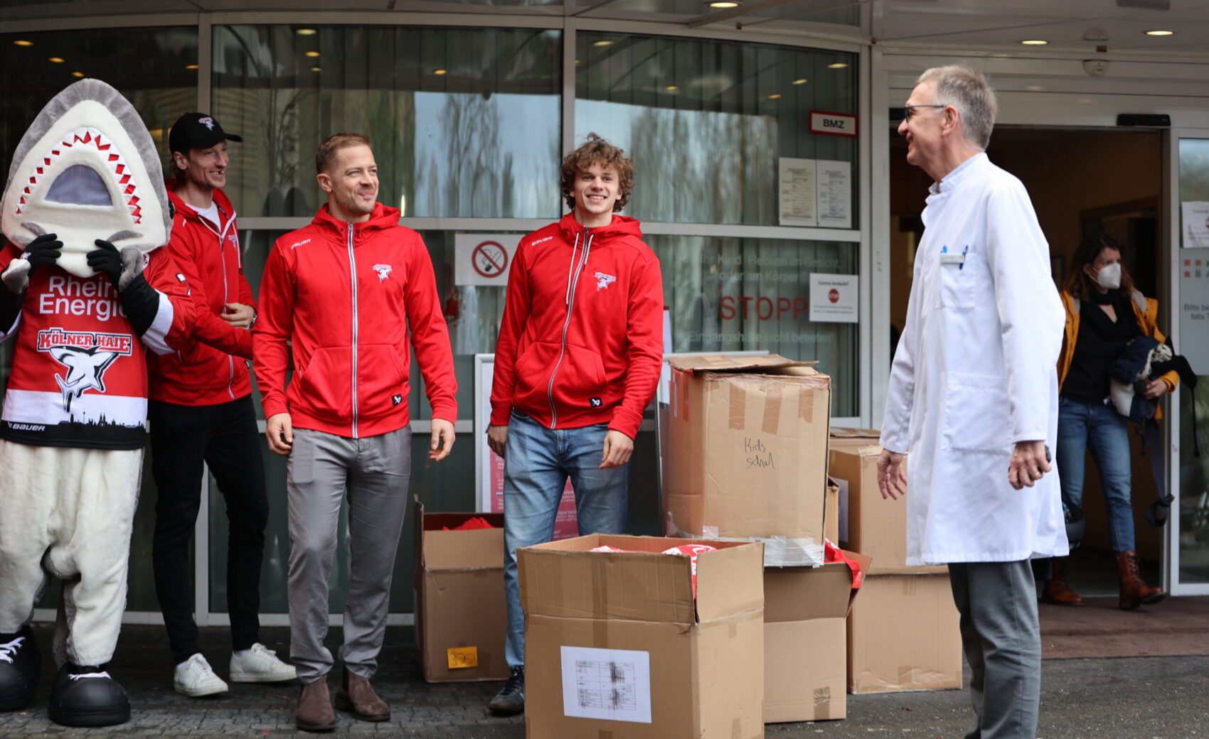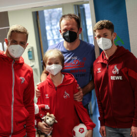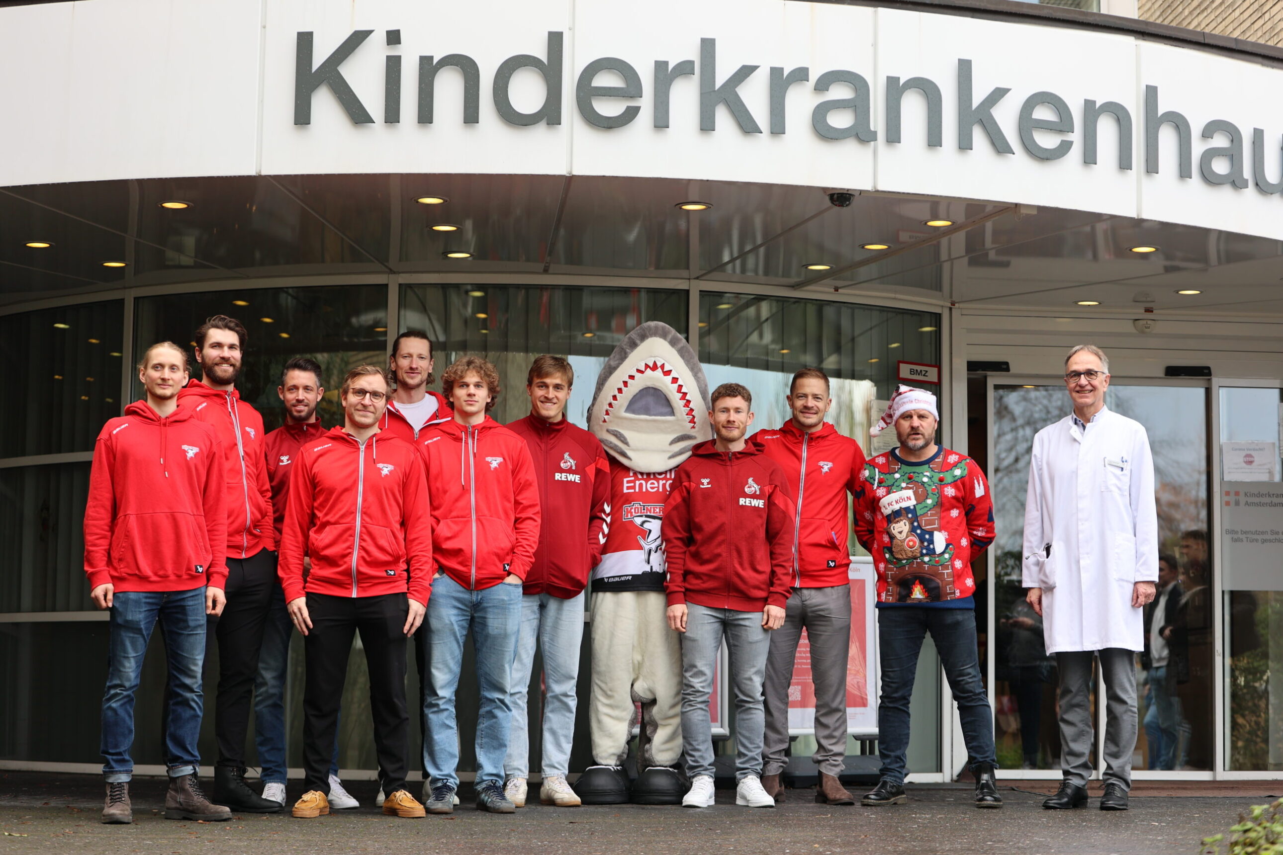 Auer, dass der 1. FC Köln kurz nach unserer Ankunft ebenfalls mit mehreren Spielern (Mark Uth, Timo Hübers und Florian Kainz) sowie Cheftrainer Steffen Baumgart im Kinderkrankenhaus ankam und dort zusammen mit unseren Jungs für strahlende Kinderaugen sorgte. Eine Geste, die Chefarzt Prof. Dr. Wei ins Schwärmen brachte: „Dass die Haie zusammen mit dem Effzeh vorbeigekommen sind, spricht für den Zusammenhalt in der Stadt und zeigt einmal mehr, dass Sport verbindet. Dass unsere Patienten am Ende die Nutznieer dieser tollen Aktion sind, ist das Schöne daran.“