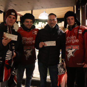 Zeitgleich waren Kapitän Moritz Müller und Angreifer Maxi Kammerer bei unseren Freunden von Radio Köln und nahmen im Nikolausdorf am Rudolfplatz live an einem kurzweiligen Talk teil, bei welchem auch die zahlreichen Fans von den Radio Köln-Moderatoren Daniel Wallroth und Gabor Leitner eingebunden wurden. Die beiden Haie brachten dem Moderator-Duo einige Geschenke mit, die wiederum für einen guten Zweck gespendet werden. Einen original gespielten Schläger Kammerers, ein Müller-Trikot sowie Tickets für ein Heimspiel kommen – wie auch das gesammelte Geld der Haie-Stunde – der „Aktion Lichtblicke“ zugute, für die Radio Köln seit Jahren sammelt. Hier findet ihr alle Informationen und könnt mitmachen!