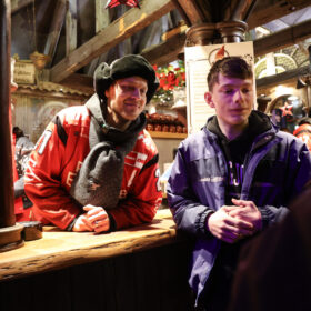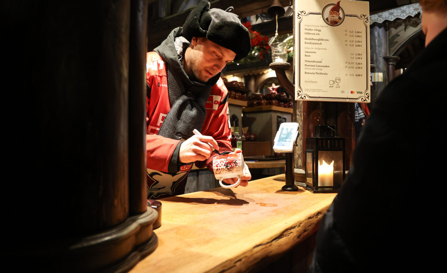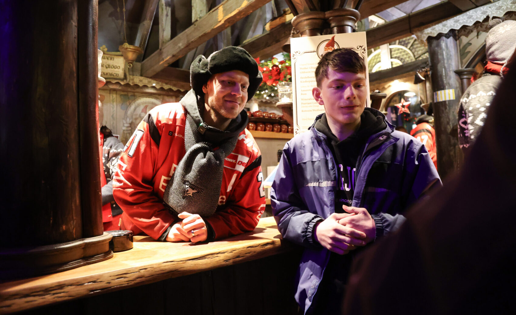 Um 17 Uhr startet unsere Mannschaft ihren Dienst und gab eine Stunde hinter den verschiedenen Tresen der Buden am Weihnachtsmarkt ihr Bestes. Ob beim Glühweinausschank, am Riesenrad, in der Pommesbude, an der Zuckerbäckerei oder auf der kleinen Eisfläche mit Übungstoren – überall hatten unsere Jungs sichtlich Spaß und packten tatkräftig mit an.