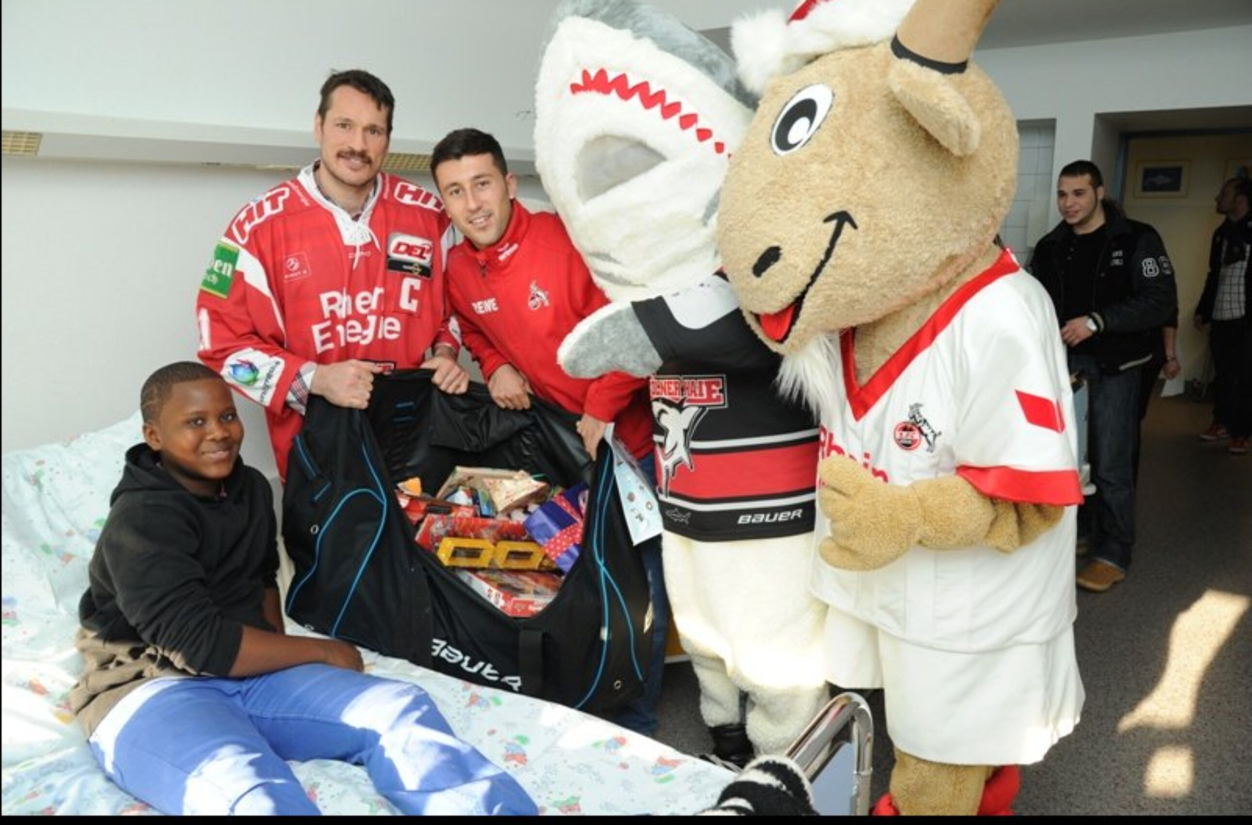 Sharky und Hennes klopfen behutsam an die Tür, dann schleichen die Maskottchen des KEC und des FC auf leiser Flosse und leisem Huf ins Patientenzimmer. Ein verdutzter Blick, dann ein Strahlen übers ganze Gesicht. Haie und FC haben am Dienstag Kinderaugen zum Leuchten gebracht. Gemeinsam brachten Spieler der beiden beliebtesten Sportvereine der Stadt Geschenke in die Kinderklinik an der Amsterdamer Strae.