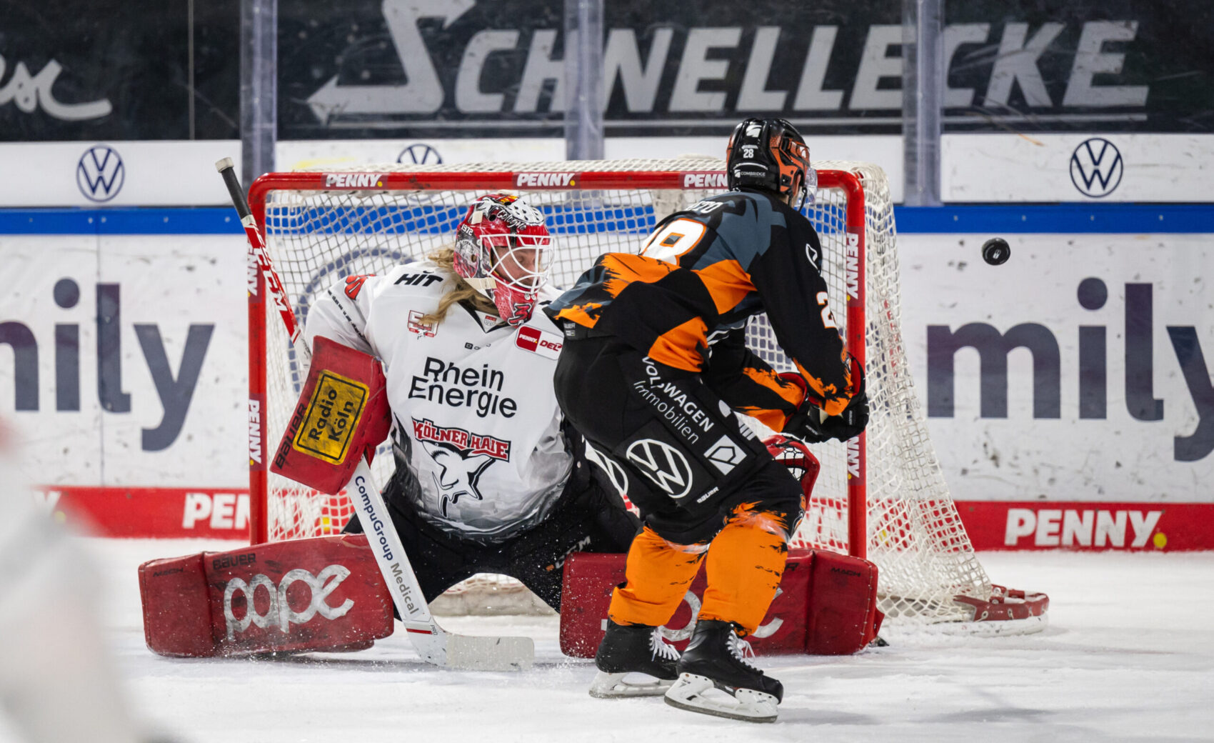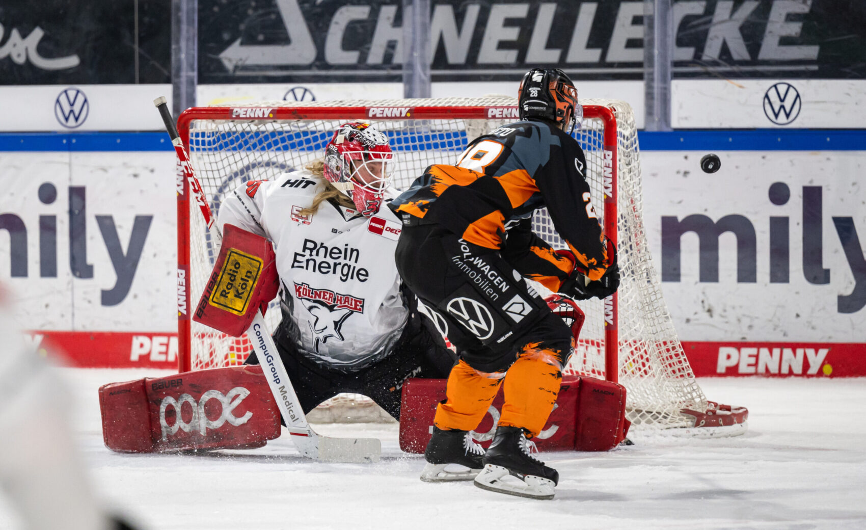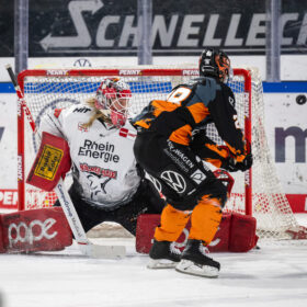 Erstmals in dieser Spielzeit bleiben die Kölner Haie torlos und müssen so zwangsläufig in eine Niederlage einwilligen. Beim 0:2 gegen die Grizzlys aus Wolfsburg beien sich die Haie mit 32 Schüssen die Zähne an der Defensive der Gastgeber aus.