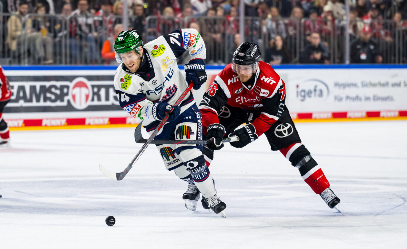 Von Beginn an entwickelte sich ein intensives und temporeiches Eishockeyspiel, in dem beide Mannschaften einmal mehr ihre Qualität unter Beweis stellten. Zunächst präsentierten sich die Gäste aus der Hauptstadt jedoch effizienter: Die deutschen Nationalspieler Jonas Müller (7.) und Frederik Tiffels (10.) sorgten mit einem Doppelschlag früh für eine 2:0-Führung der Berliner.