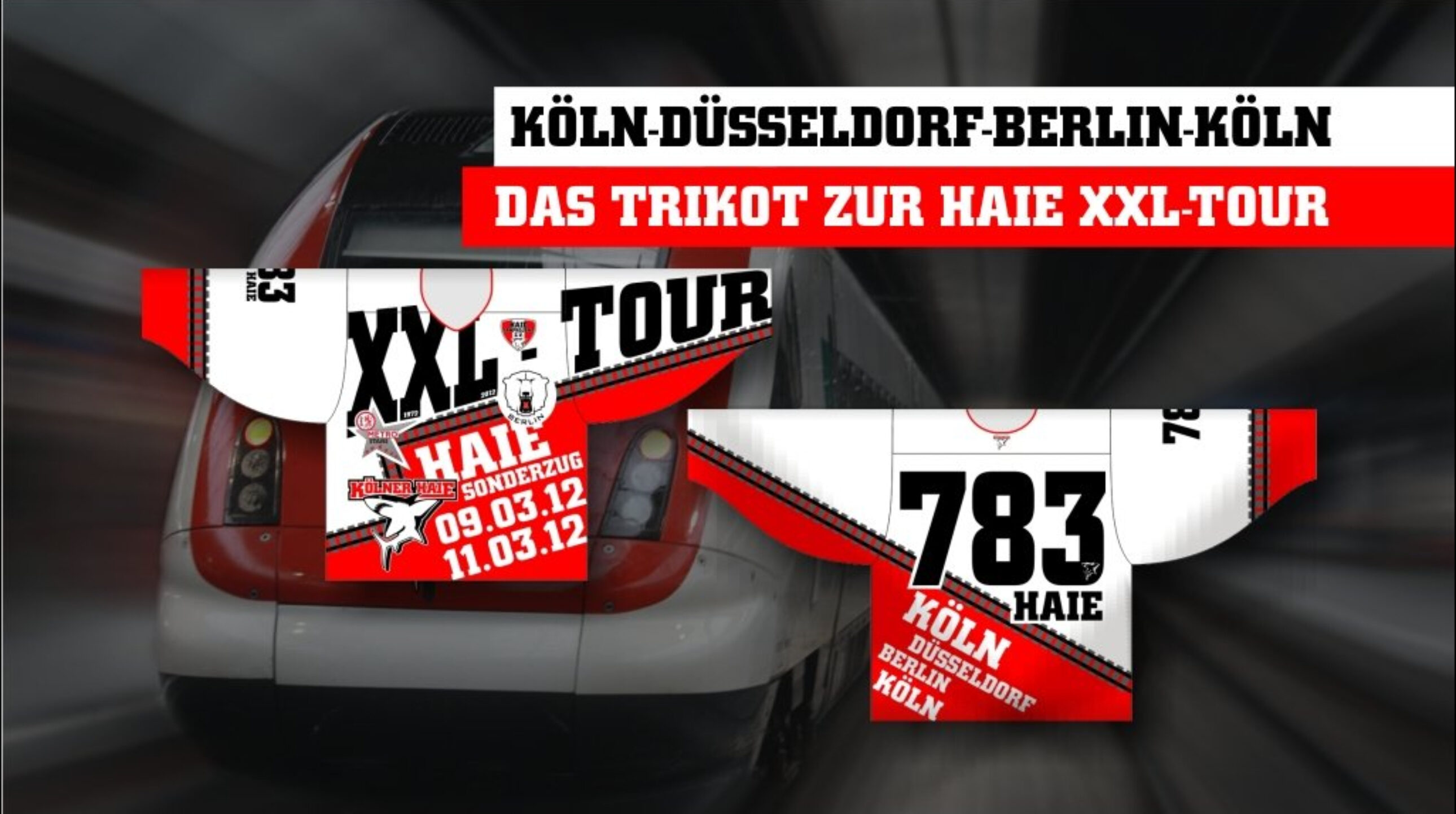 So eine Fan-Fahrt gab es noch nie: Der Countdown für die „Haie XXL“-Tour läuft! Wenige Tage nach Anmeldeschluss steht bereits fest, dass 600 Haie-Fans ihr Team am letzten Hauptrunden-Wochenende nach Düsseldorf und Berlin begleiten werden. Allein in der Hauptstadt werden 750 Kölner Fans erwartet. Für alle Haie-Fans, die im Sonderzug mit dabei sind, gibt es jetzt exklusiv das perfekte Accessoire zur Tour: Das „Haie XXL“-Trikot!