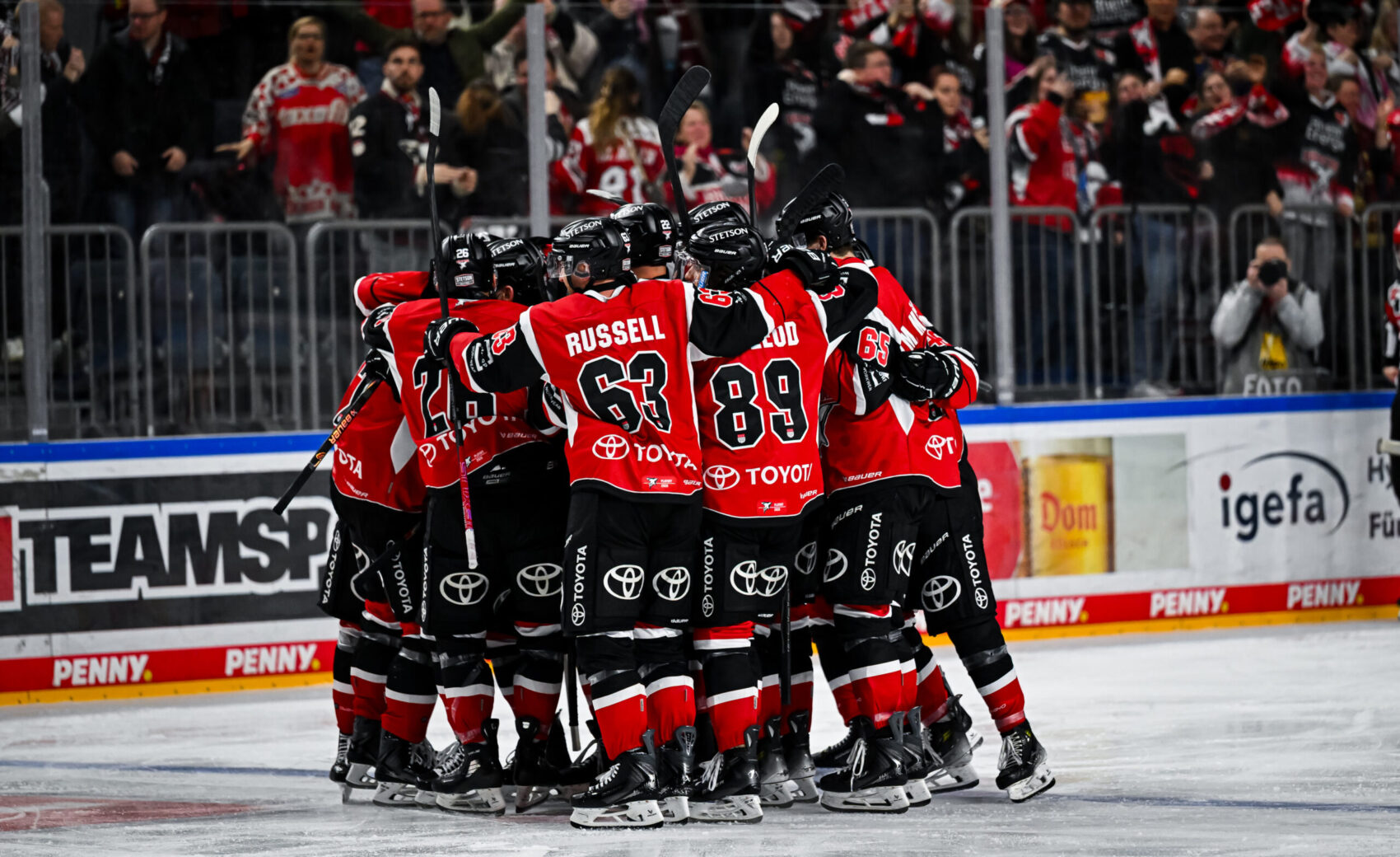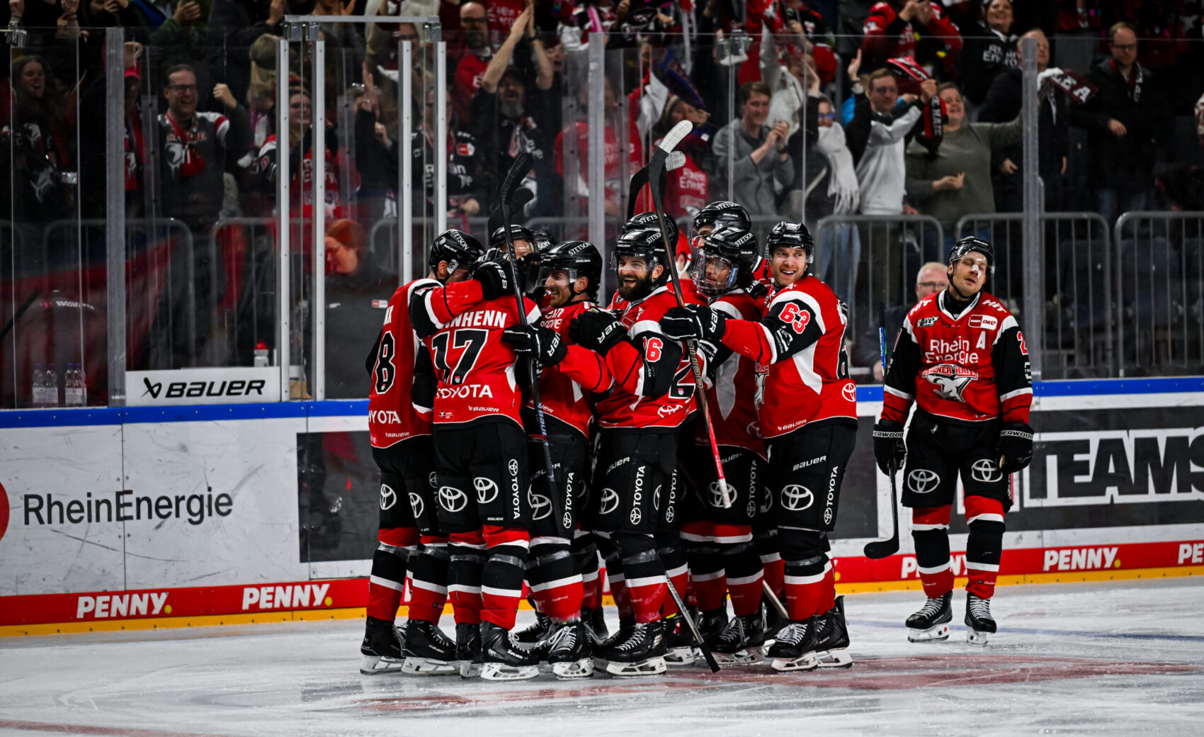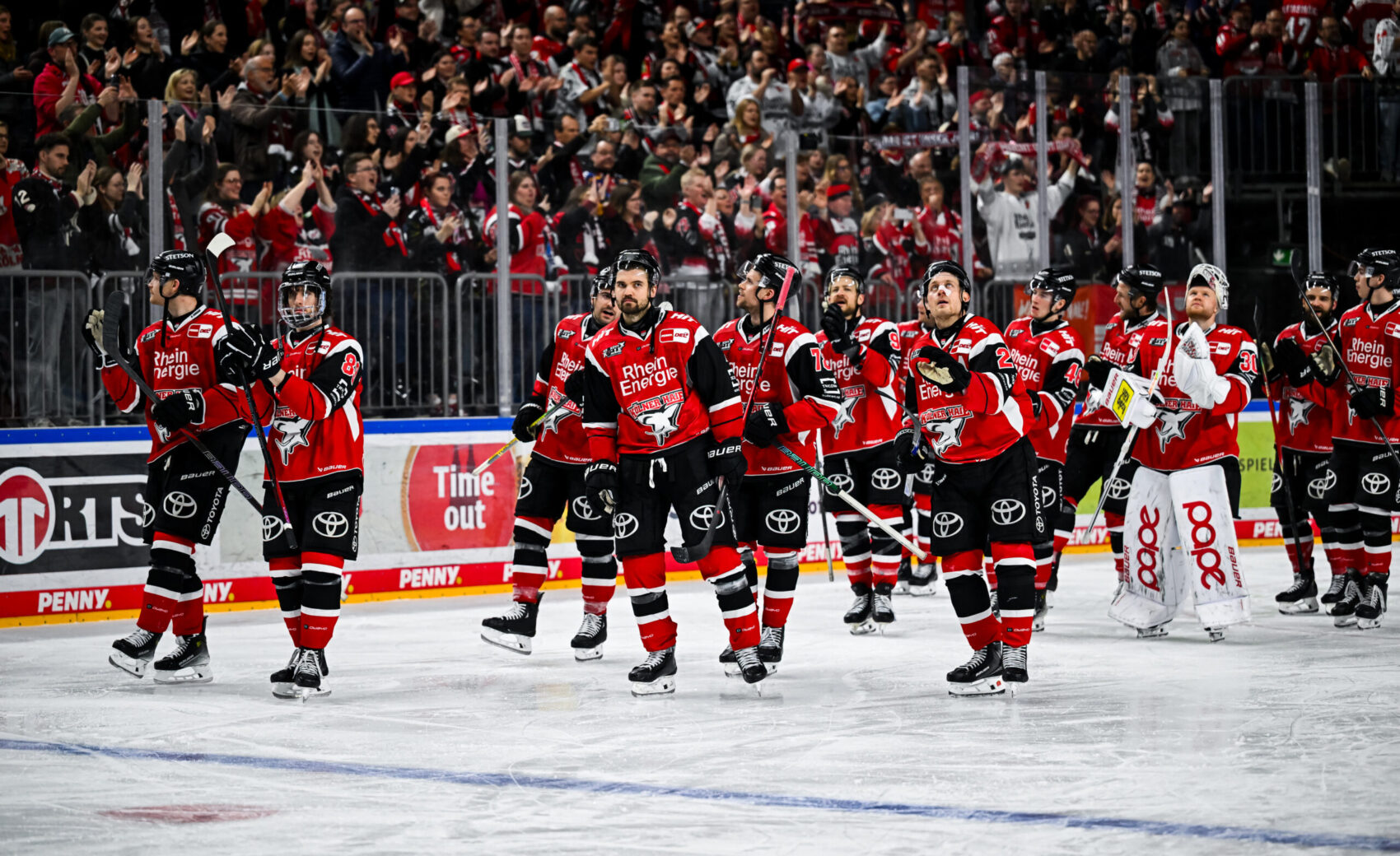 Nach 104 Minuten und gegen 23:30 Uhr fiel die Entscheidung: Wir setzten uns im gegnerischen Drittel fest, brachten den Puck an die blauen Linie, von wo aus Jan Luca Sennhenn das Hartgummi an Freund und Feind vorbei in die Maschen setzte – der viel umjubelte 2:1-Siegtreffer und damit verbundene Einzug ins Playoff-Halbfinale.
