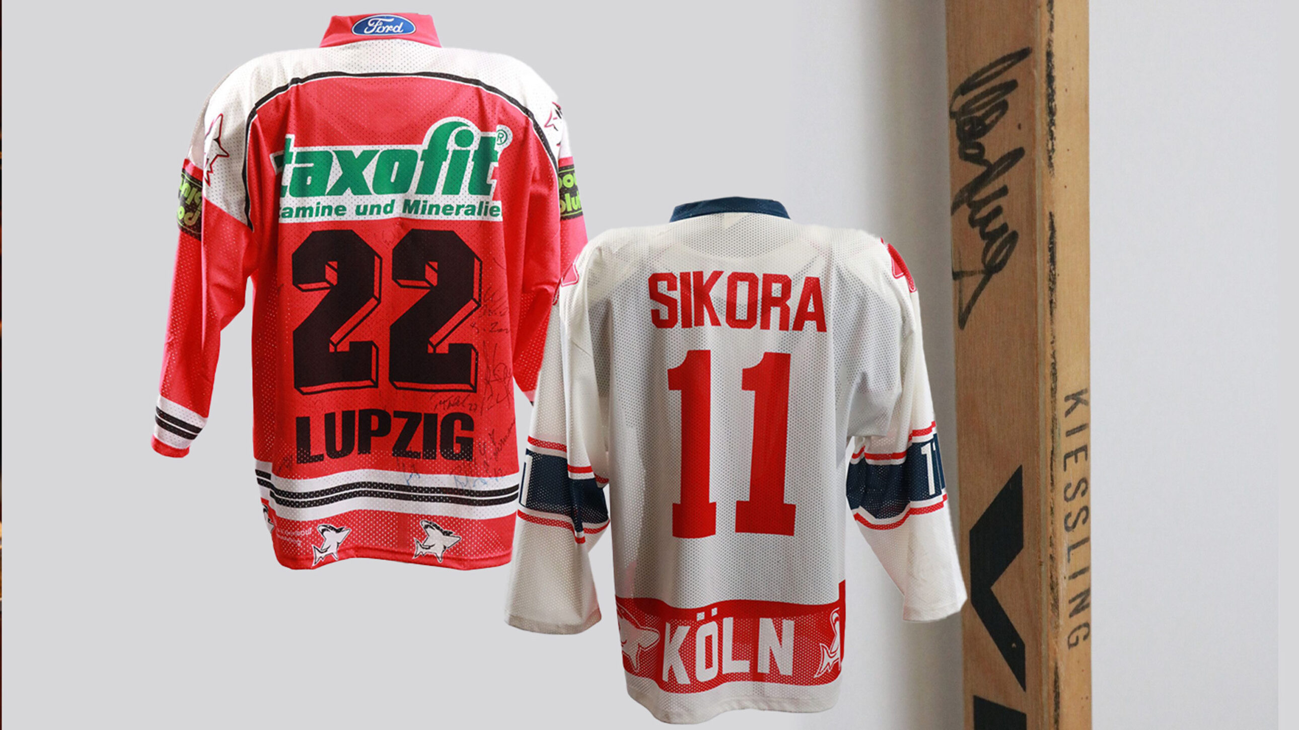 Spezielle Auktionen im ONLINEstore! Aktuell bieten wir euch fünf historische Trikots, sowie vier besondere Schläger aus vergangenen KEC-Zeiten in der Auktion an. Die Trikots und Schläger stammen aus der Privatsammlung von KEC-Fan und Junghaie-Vorstandsmitglied Hans Höfermann. Die Erlöse der Auktionen gehen zu 100% an die Junghaie und werden am „Tag der Junghaie“ beim Heimspiel gegen Nürnberg (Sonntag, 17. Dezember – 16:30 Uhr) an den Nachwuchs übergeben.