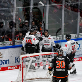 Drei Minuten nach Beginn der letzten zwanzig Minuten konnten die Haie an diesem Sonntagabend das erste Mal in Führung gehen – nach einem Scheibengewinn tief im eigenen Drittel spielte Jon Matsumoto einen überragenden Pass auf Nicholas Baptiste, der frei vor Hildebrand zur Führung traf! Nach einem individuellen Fehler des Frankfurter Torwarts stellte Landon Ferraro an alter Wirkungsstätte sogar auf 4:2 (46.). Doch die Löwen, die als Aufsteiger in dieser Spielzeit gerade in den letzten Minuten schon so manche Partie drehten, warfen nun alles nach vorne und stemmten sich gegen die drohende Niederlage.