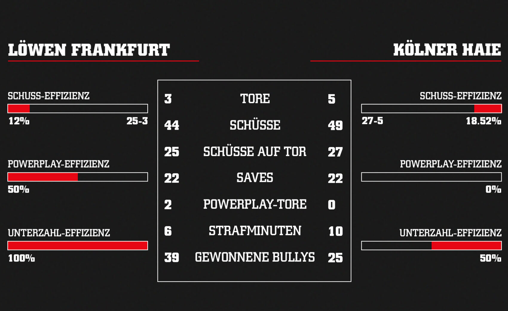 In einem schweren Auswärtsspiel vor stimmgewaltiger Kulisse bei den Frankfurter Löwen behalten die Haie kühlen Kopf und haben auf zwischenzeitliche Rückstände immer die passende Antwort. Beim 5:3-Sieg können sich gleich vier unterschiedliche Haie in die Torschützenliste eintragen. KEC-Cheftrainer Uwe Krupp feiert durch den Erfolg in Frankfurt seinen 300. Sieg als Trainer in der PENNY DEL.