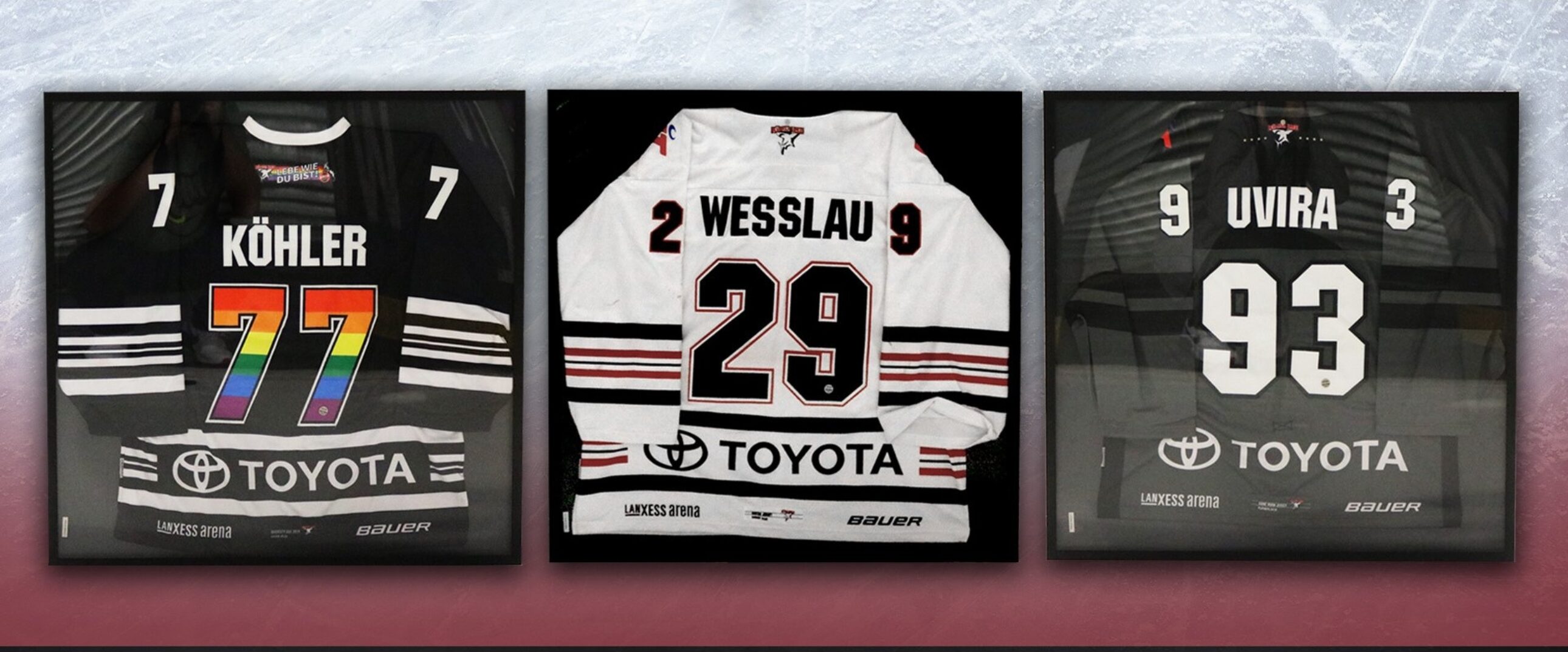 Ein besonderes Highlight unter den Game-Worn-Trikots bilden das Auswärts-Trikot von Gustaf Wesslau #29 und das Diversity-Day-Trikot von Mick Köhler #77 aus der Spielzeit 2019/20 sowie das Playoff-Trikot von Sebastian Uvira #93 aus der Saison 2018/19. Letztere wurden dem KEC durch die Heroes Group AG kostenlos zur Verfügung gestellt. Die Trikots kommen in hochwertigen Rahmen von Living.Steel (Wert von 184,24 Euro). Damit unterstützt neben Heroes auch ein zweiter Haie-Partner in besonderer Weise diese Auktion.