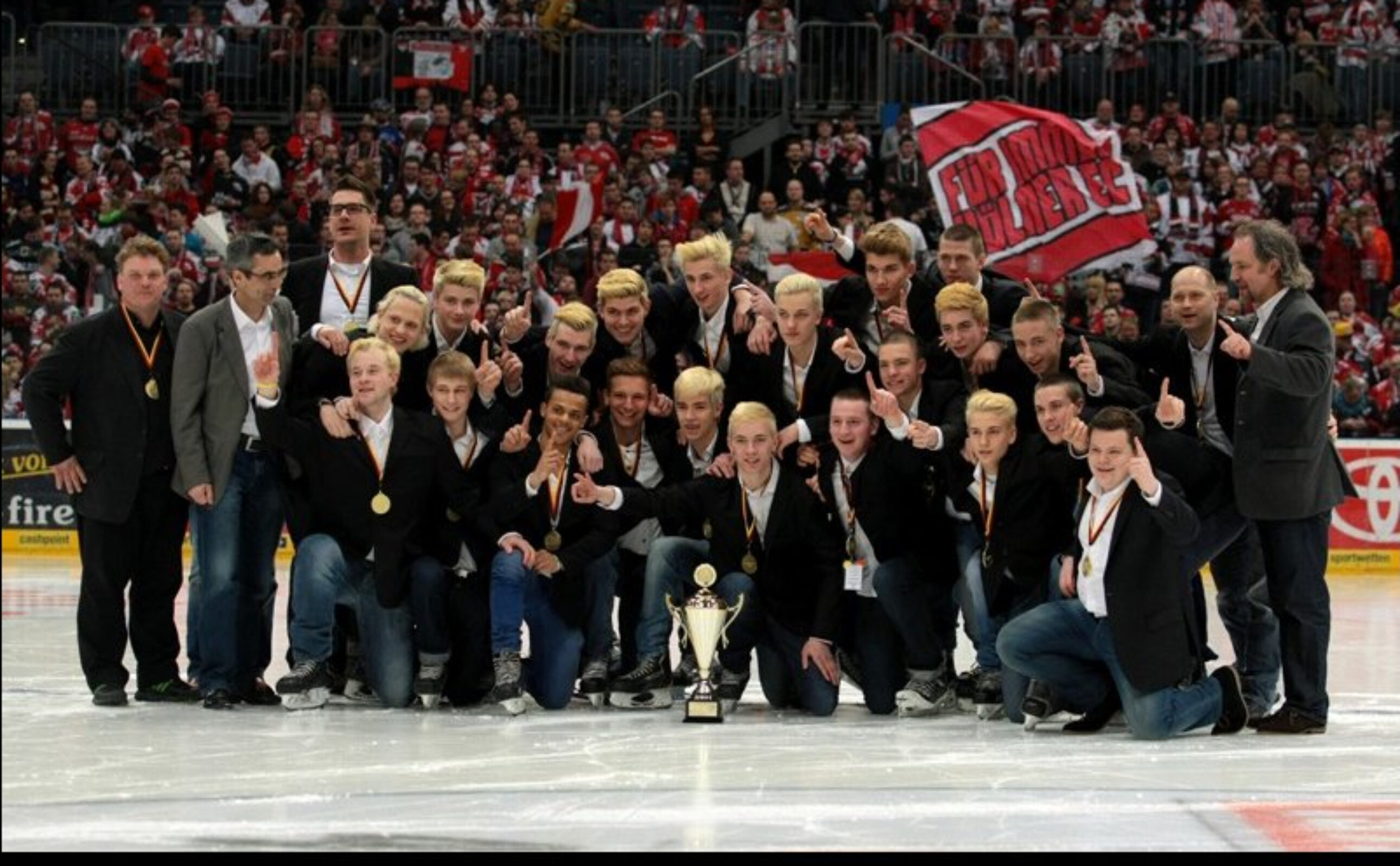 Diese Ehrenrunde haben sich die Jungs verdient. Beim Playoff-Spiel gegen Straubing an Gründonnerstag wurde die Jugendmannschaft des KEC für den Gewinn der Bundesliga-Meisterschaft und den damit verbundenen Aufstieg in die DNL ausgezeichnet. Gefeiert von knapp 12.000 Zuschauern erhielt Kapitän Finn Walkowiak den Meisterpokal aus den Händen von U-20-Nationaltrainer Ernst Höfner.
