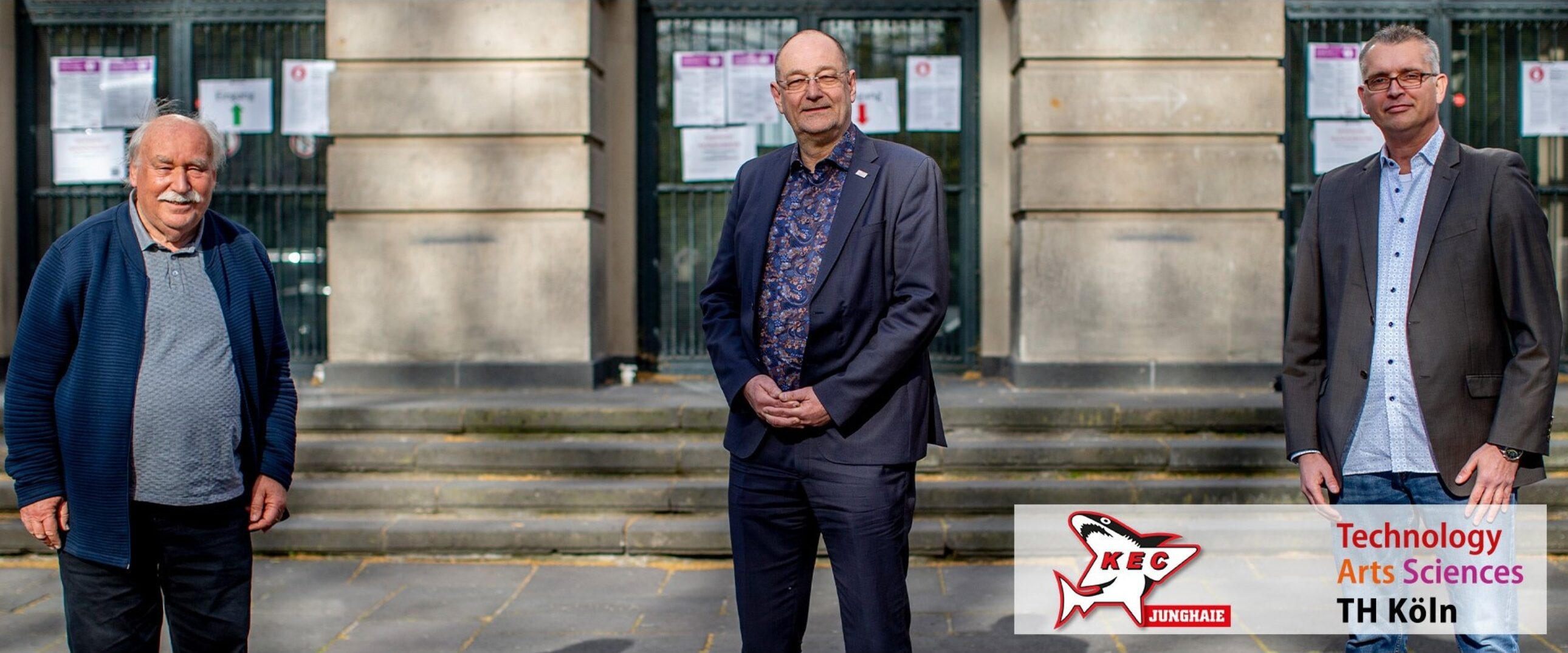 Im Bild: v.l. Rainer Maedge (Präsident KEC e.V.), Prof. Dr. Stefan Herzig (Präsident TH Köln) und Alexander Kollorz (Vizepräsident KEC e.V.) vor der TH Köln (Foto: Thilo Schmülgen/TH Köln)