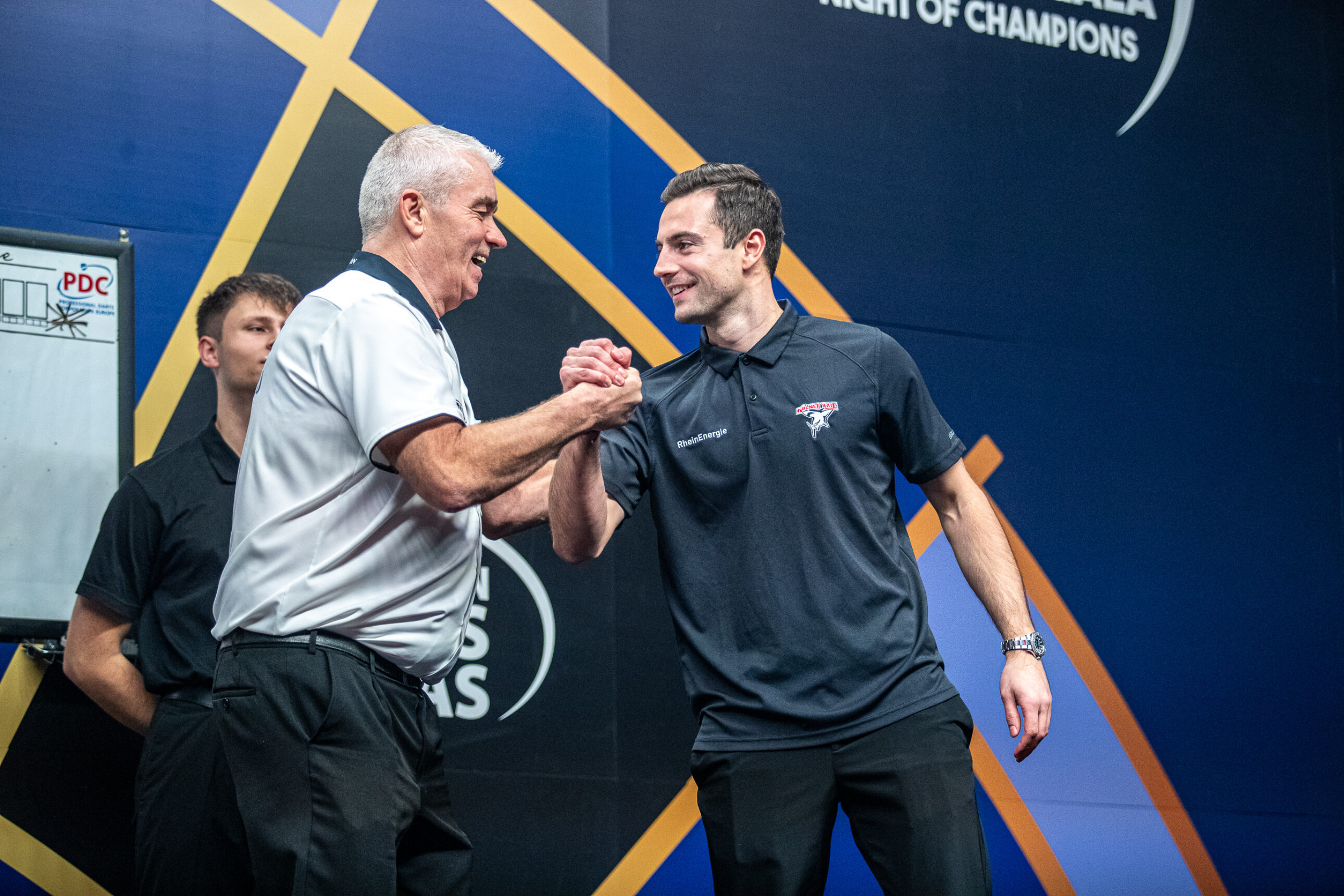 Am Freitagabend waren unsere Spieler Maximilian Kammerer und Håkon Hänelt Gastspieler bei der PDC World Darts Gala in der LANXESS arena, die niemand Geringeres als der Niederländer Michael van Gerwen gewann. Vor 11.000 Zuschauern spielten unsere Profis auf der Bühne ein kurzweiliges Showmatch, wurden dabei unter anderem von Teamkollegen im Publikum unterstützt und schlugen sich dabei mehr als wacker.