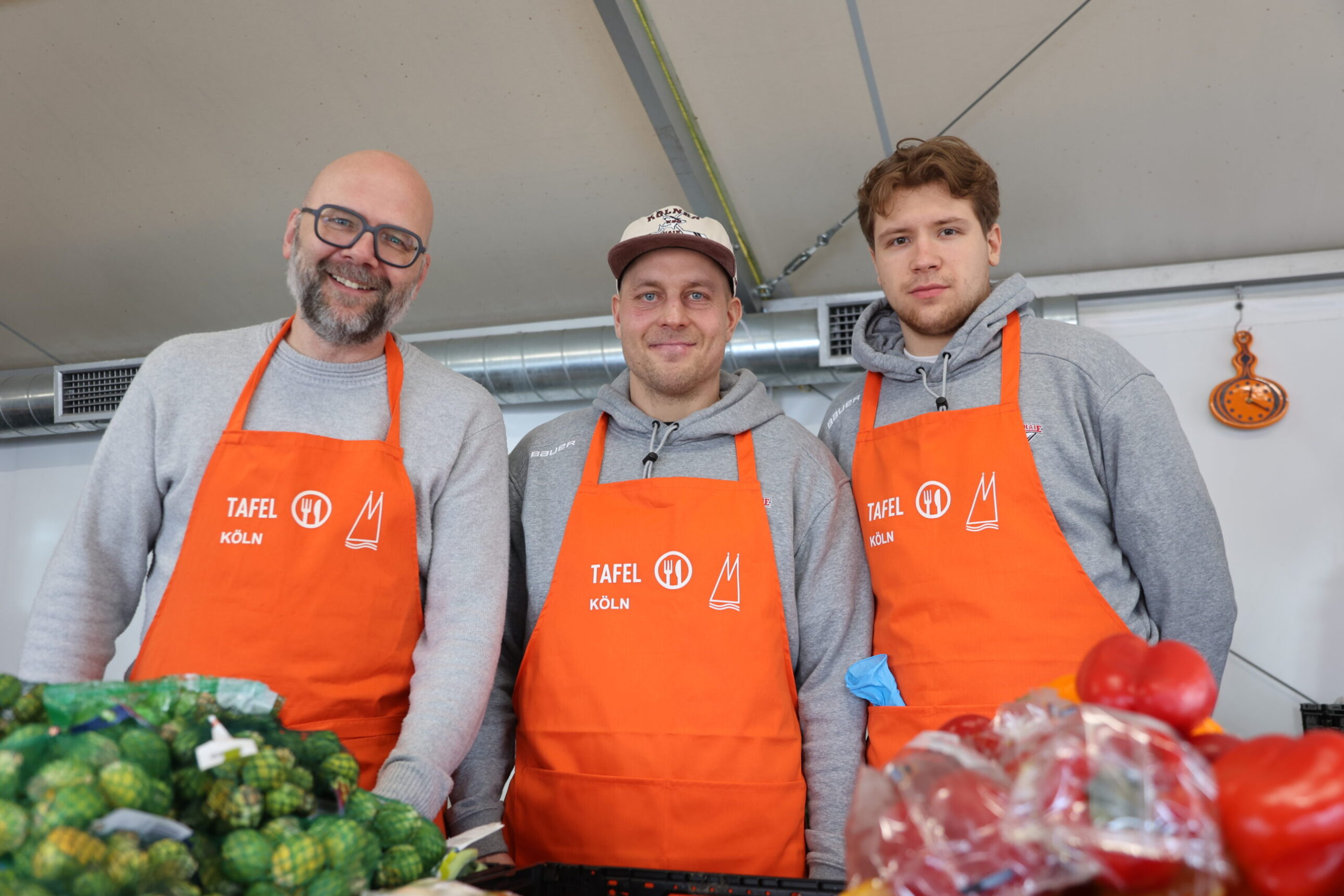 Wie bereits im vergangenen Jahr, als u.a. Geschäftsführer Philipp Walter, Co-Trainer Manuel Kofler und Frederik Storm mit dabei waren, haben wir auch in diesem Jahr wieder mit angepackt und bei der Lebensmittelausgabe geholfen. Seit der vergangenen Saison arbeiten wir eng mit der Tafel Köln zusammen und lassen diese auch immer wieder in Spieltage einfließen – so rufen wir euch zusammen mit der Tafel immer wieder dazu auf, Lebensmittelspenden vor Spielen der Haie vorbeizubringen. Die nächste Spende ist am Sonntag, den 23. November vor dem Heimspiel gegen die Schwenninger Wild Wings möglich, ab 14 Uhr können Haie-Fans ihre Lebensmittelspenden auf dem Plateau der LANXESS arena am Tafel-Stand abgeben.