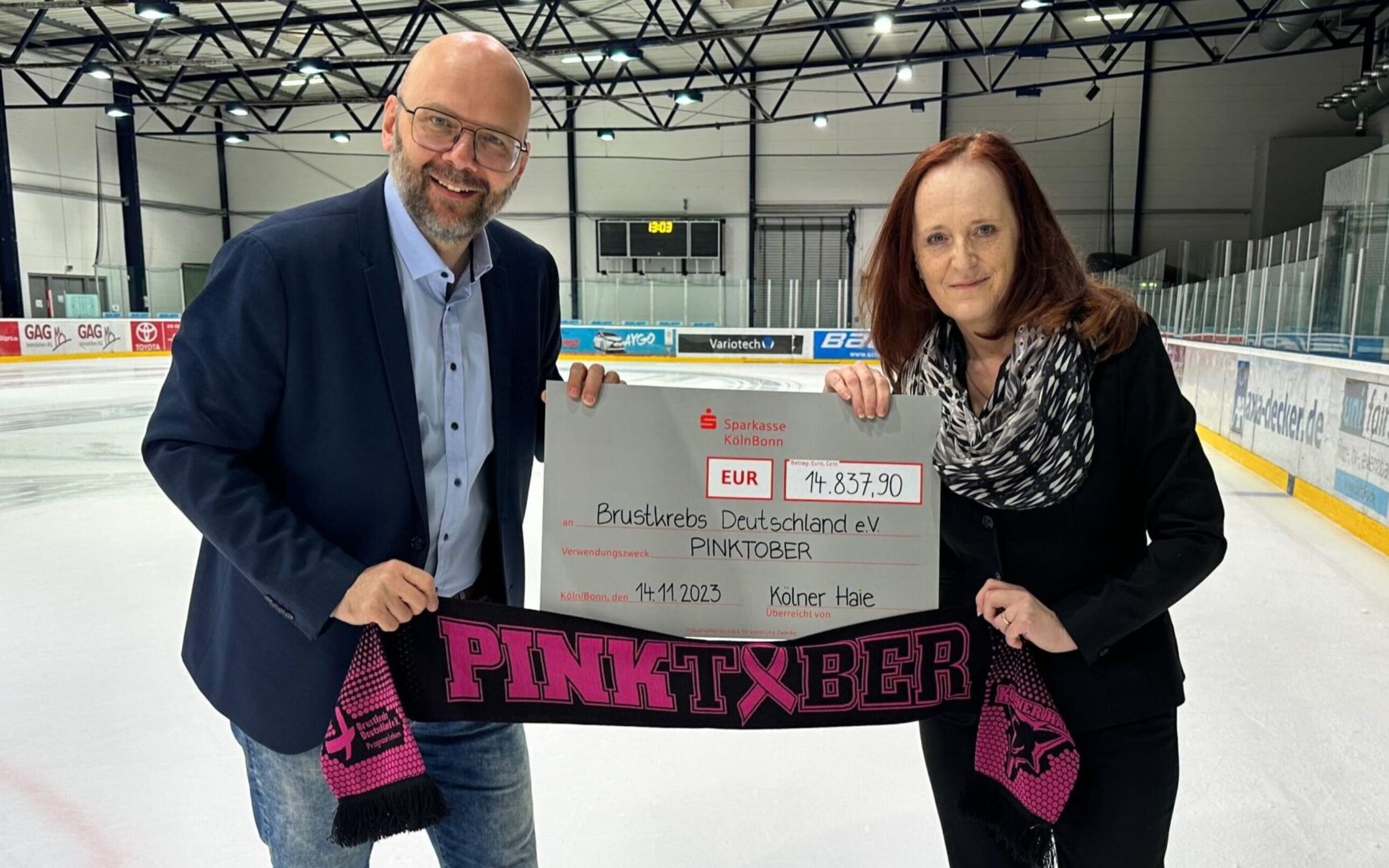 Haie-Geschäftsführer Philipp Walter übergab Inge Günnink, Leiterin Regionalvertretung NRW des Brustkrebs Deutschland e.V., heute im Haie-Zentrum den groen Spendenscheck über 14.837,90 Euro.