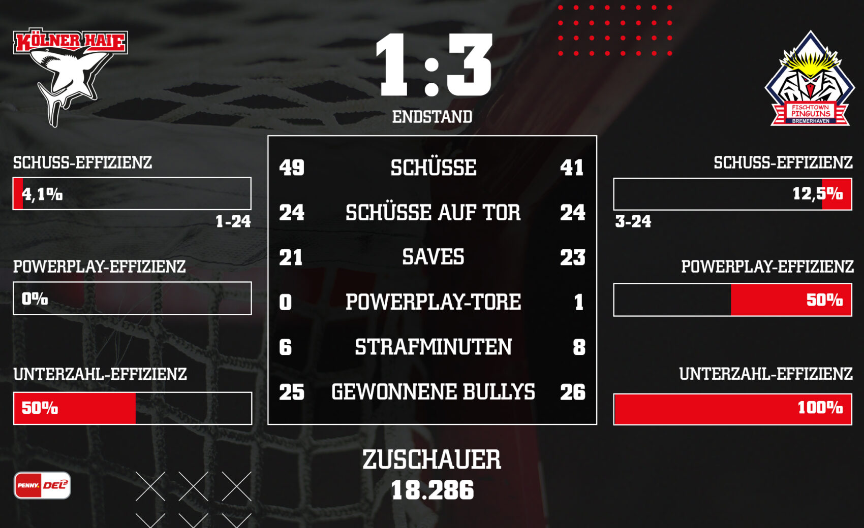 In einem umkämpften Heimspiel gegen die Fischtown Pinguins Bremerhaven müssen wir uns am Ende mit 1:3 geschlagen geben. Einen frühen Zwei-Tore-Rückstand können wir trotz groem Kampf im Schlussdrittel nur halbieren, ehe die Gäste aus dem hohen Norden per Empty-Netter für den Endstand sorgen. Wir haben den Spielbericht.