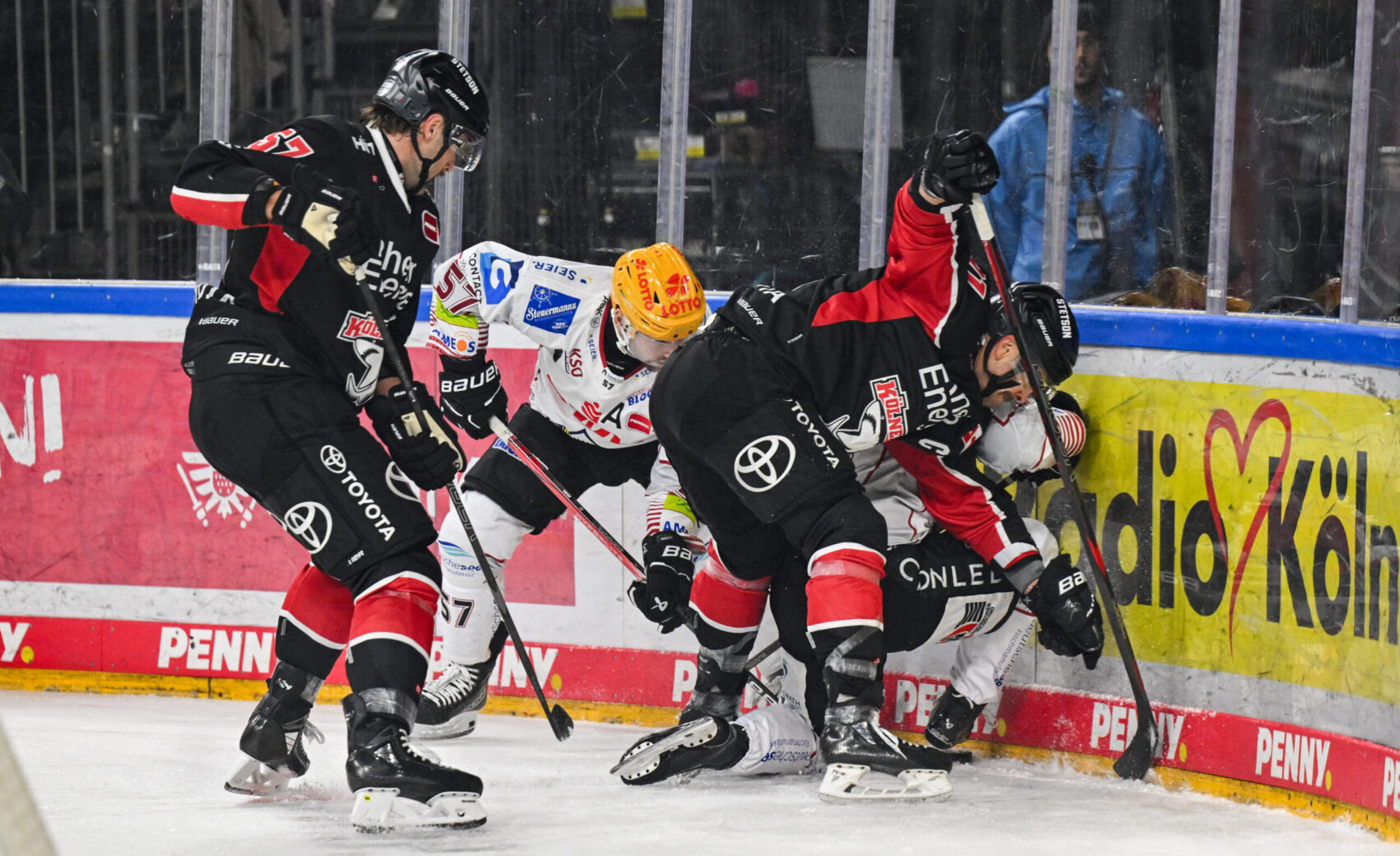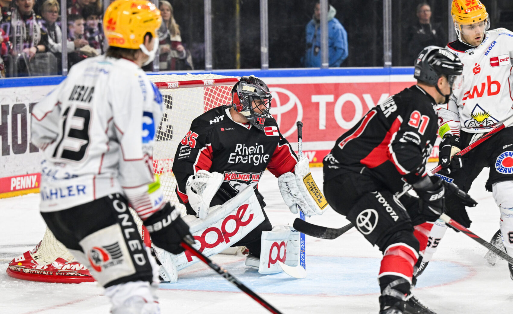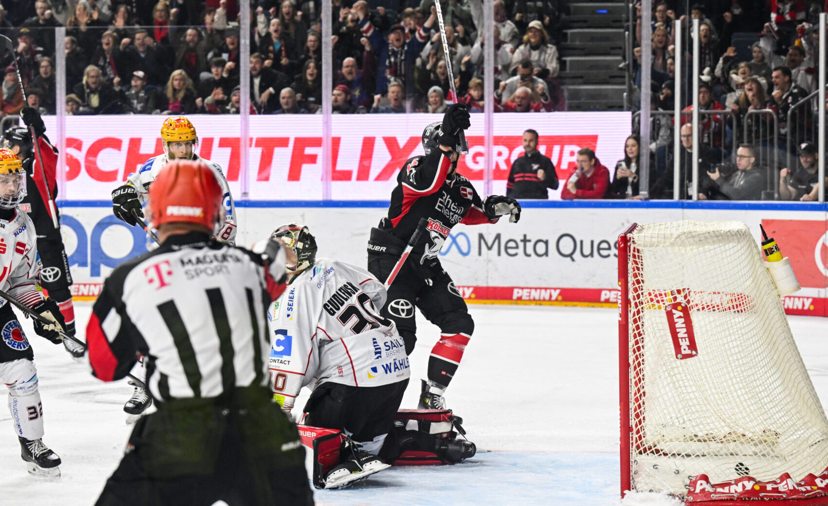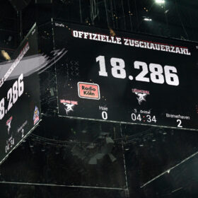 Die Anfangsminuten in einer mit 18.286 Zuschauern fast ausverkauften LANXESS arena gehörte unserer Mannschaft. Louis-Marc Aubry hatte sowohl in der 1. Minute von hinter dem Tor, als auch vier Zeigerumdrehungen später bei einem Schuss knapp neben den Kasten die Führung auf der Kelle. Diese sollte kurz darauf den Gäste gelingen. Einen druckvollen Wechsel mit einigen Abschlüssen nutzte Herrmann aus dem Slot zur Führung der Nordlichter. Fünf Minuten darauf baute diese Uher nach wenigen Powerplay-Sekunden auf 0:2 aus. Mit diesem Zwischenstand ging es in die erste Pause.