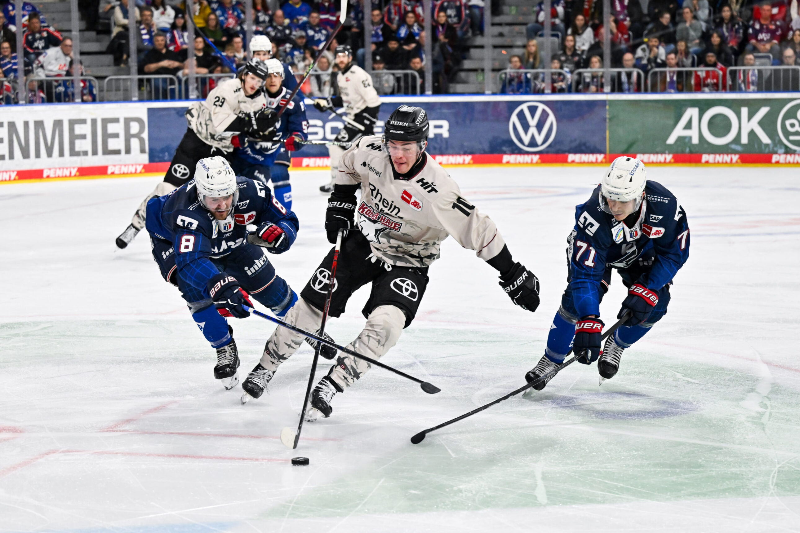 In einem von Beginn an temporeichen und hochklassigen Spiel erwischten wir den besseren Start. Zehn Sekunden waren gerade einmal gespielt, da feuerte Moritz Müller den ersten vom am Ende insgesamt 45 Haie-Schüssen ab. Auch in den Folgeminuten spielten wir gut auf und kamen durch Kammerer und Austin zu weiteren guten Abschlüssen. Die Adler wurden anschließend, auch bedingt durch eine frühe Überzahl, aktiver und kamen besser in der Partie an. Es entwickelte sich fortan ein offener Schlagabtausch mit wenig Spielunterbrechungen, was für ein hohes Tempo auf dem Eis sorgte. Durch die gut aufgelegten Defensivreihen beider Teams ging es torlos in die erste Pause.