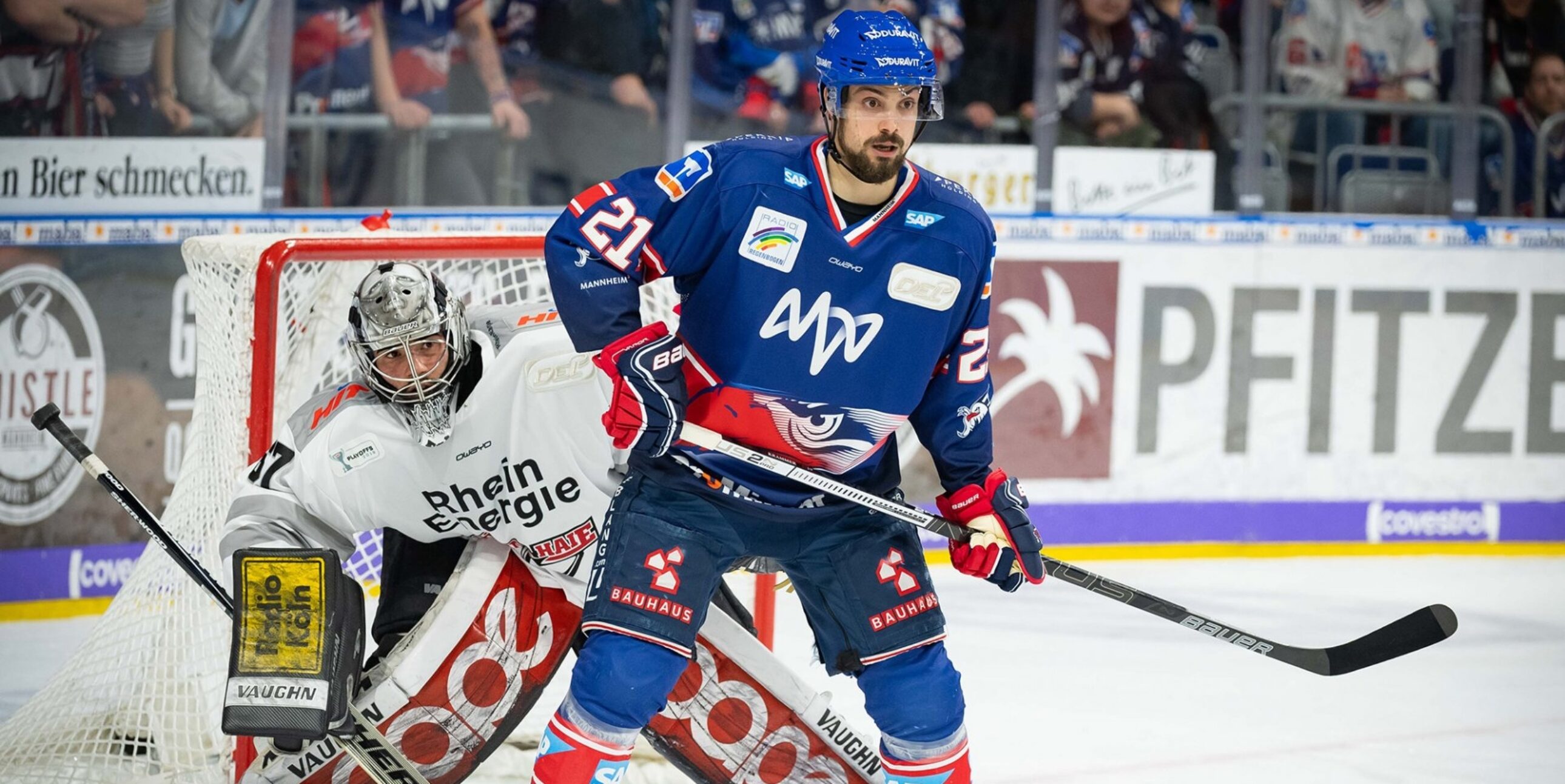 Die Kölner Haie unterliegen mit dem knappsten aller möglichen Ergebnisse in Mannheim. 0:1 heit es am Ende in Halbfinal-Spiel 1.