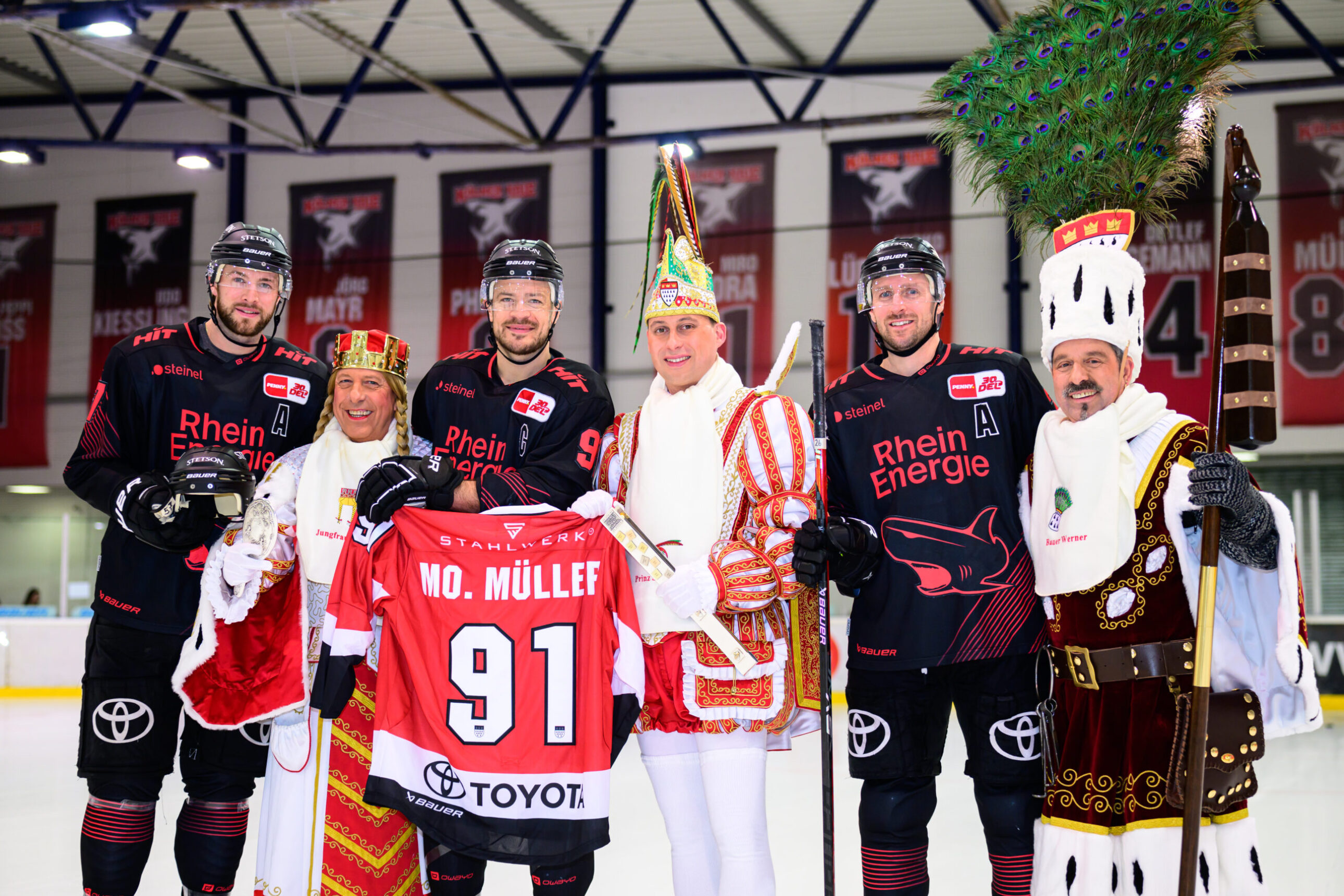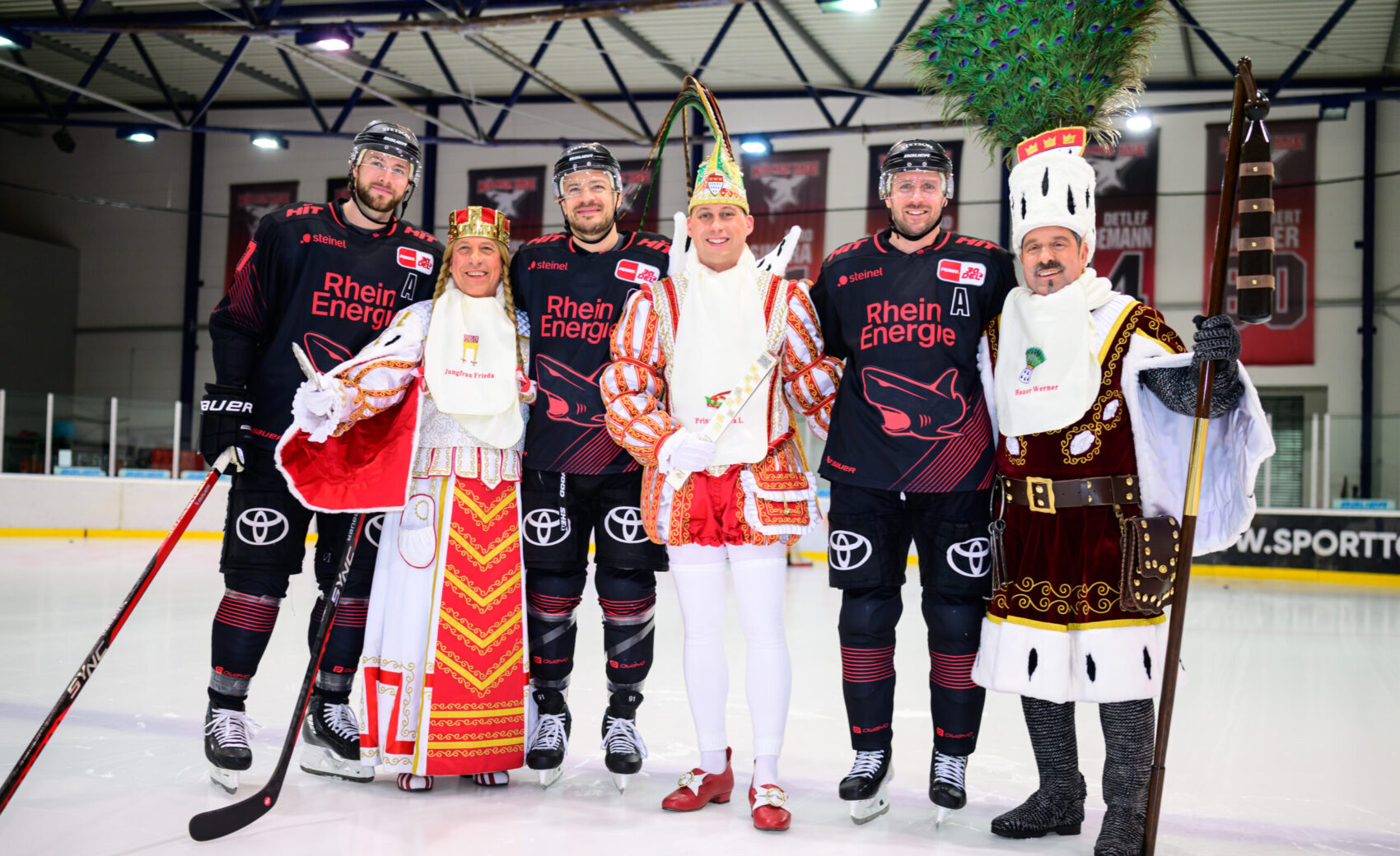 Am Samstag besuchte uns das Kölner Dreigestirn in unserem Haie-Zentrum und traf dabei vor dem Training auf „unser Dreigestirn“ mit Kapitän Moritz Müller sowie den Assistenzkapitänen David McIntyre und Brady Austin. Das prestigeträchtige Kölner Dreigestirn, bestehend aus Prinz, Bauer und Jungfrau, ist offizieller Regent über das närrische Volk in Köln und hat in dieser Session einen ganz besonderen KEC-Bezug.