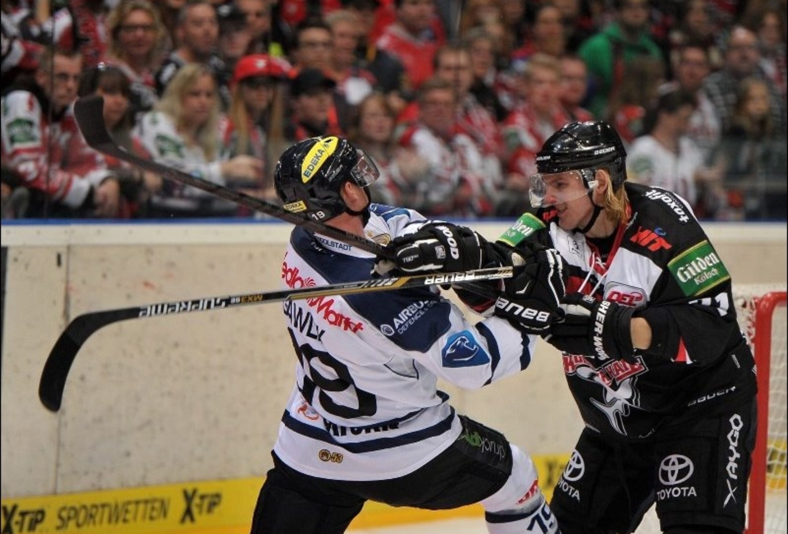 41. Strafe gegen Kölns Minard: Zwei Minuten wegen Hakens plus zwei Minuten wegen Reklamierens. Vier Minuten Unterzahl. Kämpfen Haie!