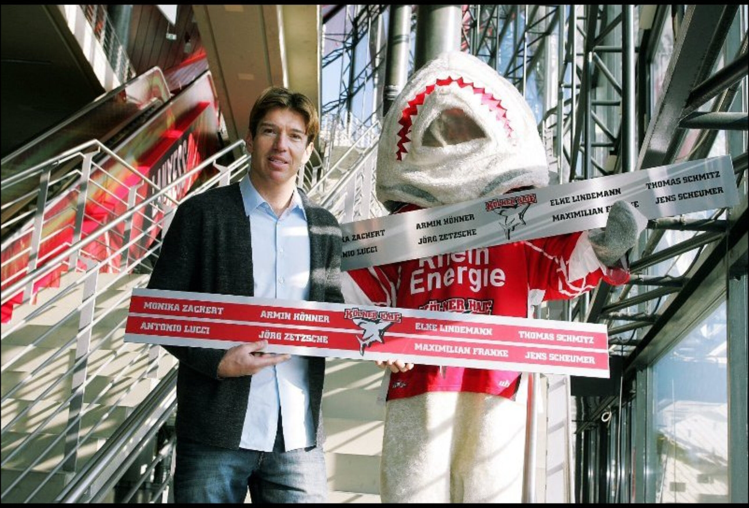 Pro Schild werden acht Namen (Vor- und Familienname) auf einer Stufe der Foyer-Treppen verewigt. Auf jedem der Schilder zeigt zudem ein zentrales Haie-Logo, wofür das Herz der acht Menschen schlägt. So erobern die Fans Stufe für Stufe und Treppe für Treppe die Arena. Ob bei Konzert, Jahreshauptversammlung, Eishockey-Länderspiel, Haie-Derby, Comedy-Show oder Box-Kampf – die Schilder strahlen bei jedem Event in der LANXESS arena von den Stufen im Foyer. Da wird jedem Besucher klar: Das ist die Arena der Haie-Fans!